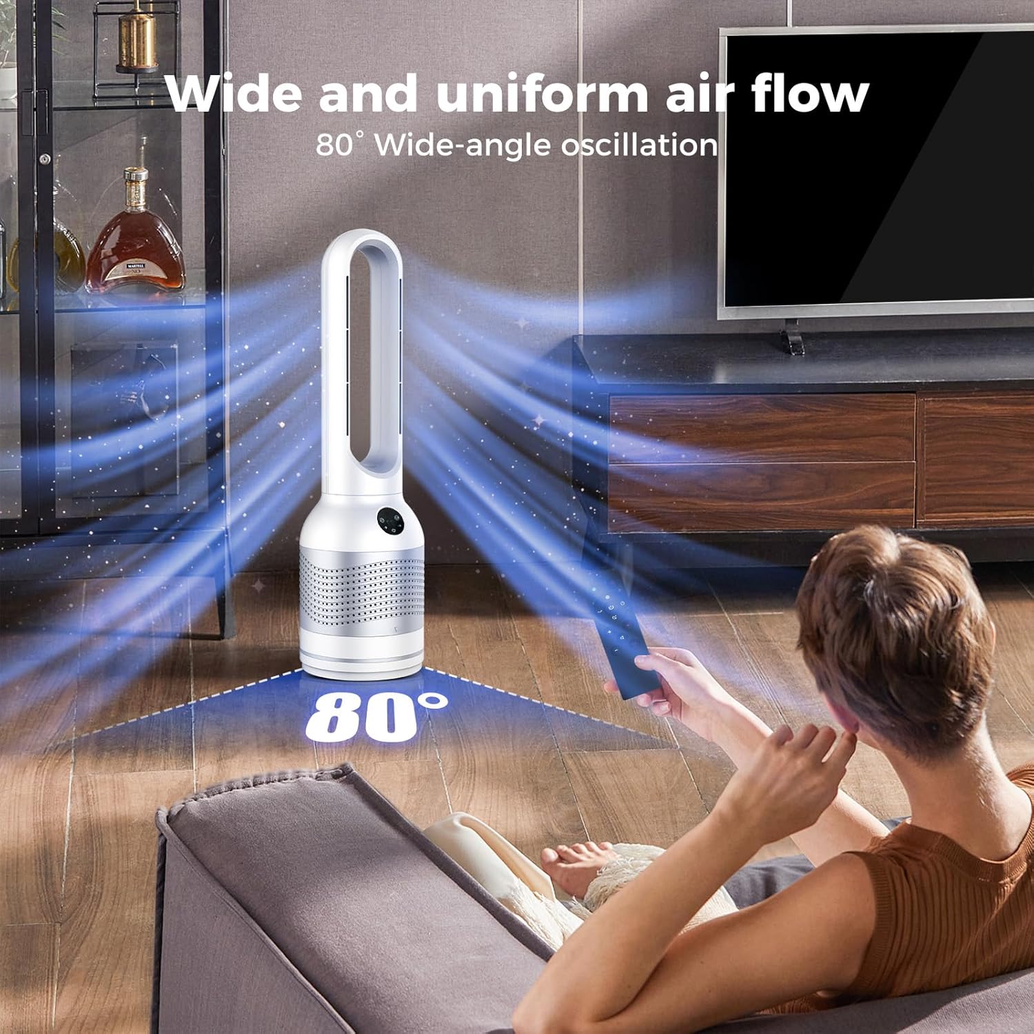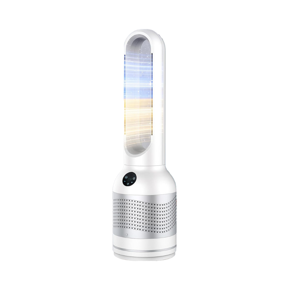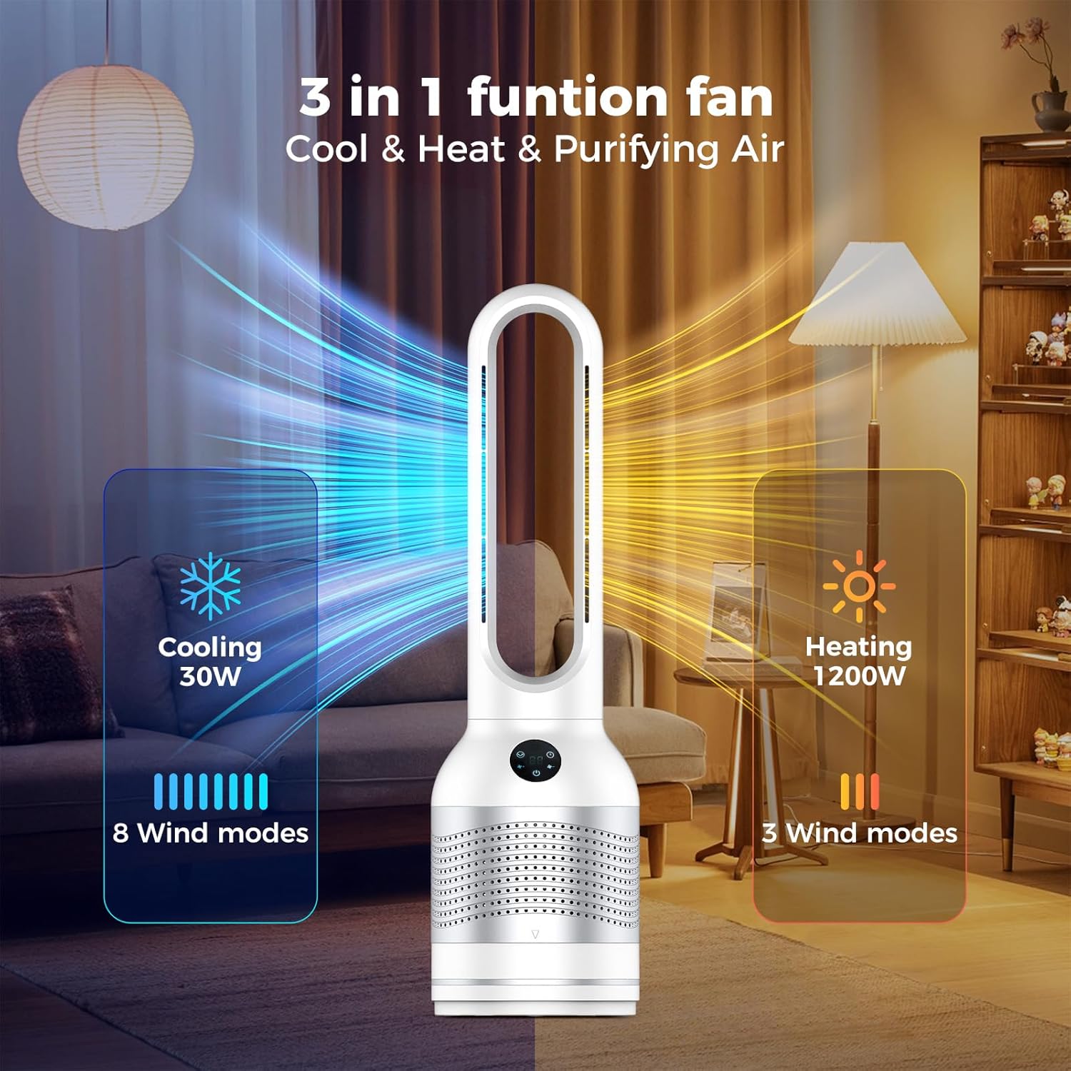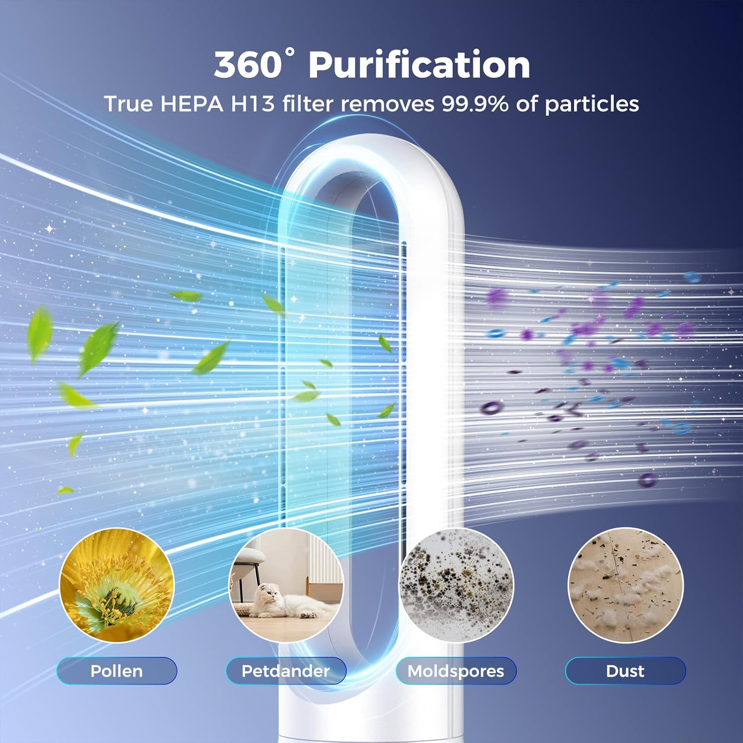 The Spector 3-in-1 Bladeless Fan is a **cooler, heater, and air purifier** all in one. It features **8 fan speeds**, **3 heating modes**, and a **HEPA H13 filter** for air purification. With **80° wide-angle oscillation**, tip-over and overheat protection, plus control via **remote or touch panel**, this unit is designed to keep your space comfortable and clean year-round.