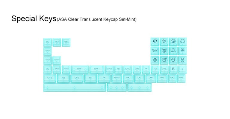 The Akko Keycap Set – Clear ASA Mint is a 155-key PBT keycap set with ASA profile, featuring a refreshing mint color scheme. Designed for compact and full-size mechanical keyboards, it provides a comfortable typing experience and durable double-shot legends. Compatible with MX-style mechanical switches, it is ideal for both aesthetic upgrades and functional use.