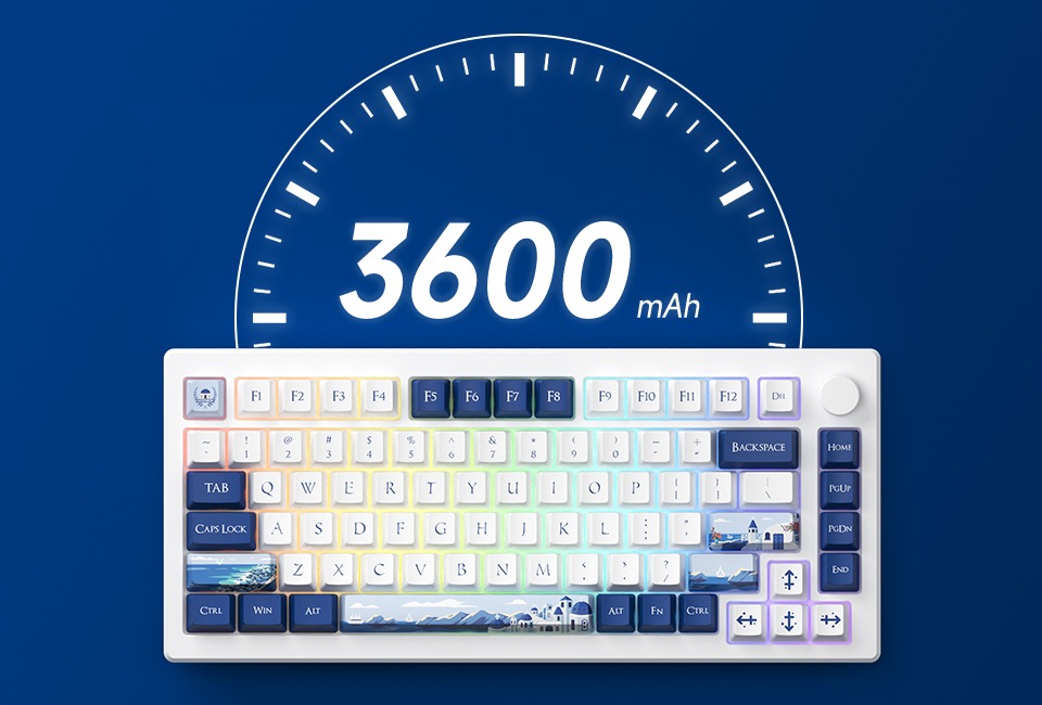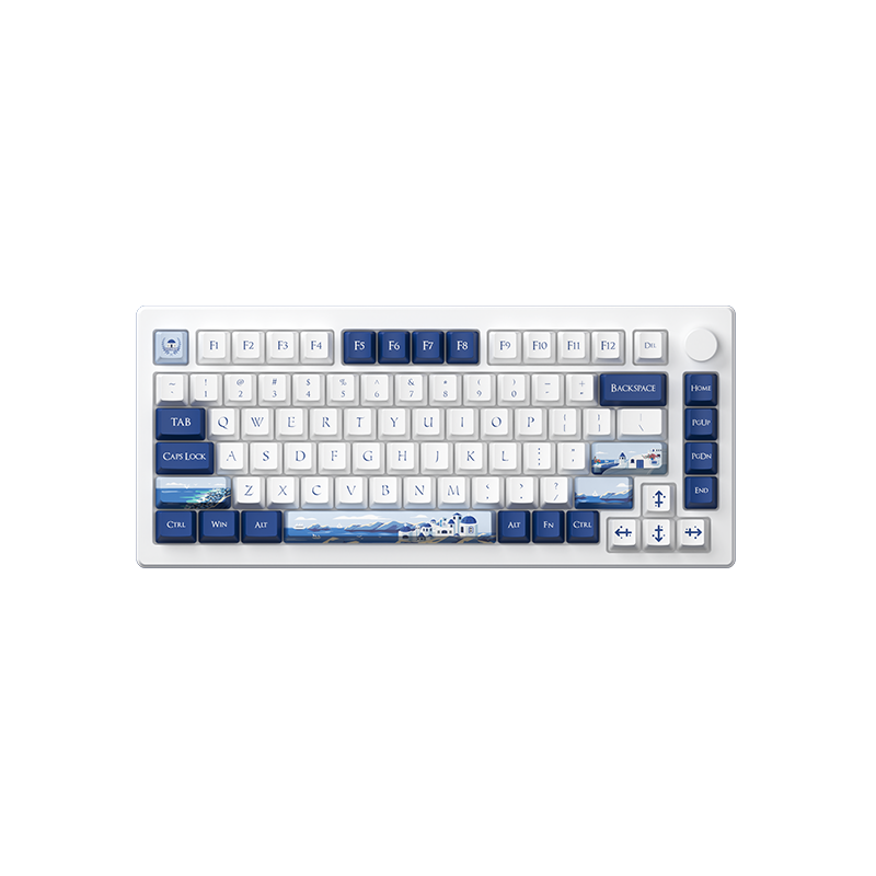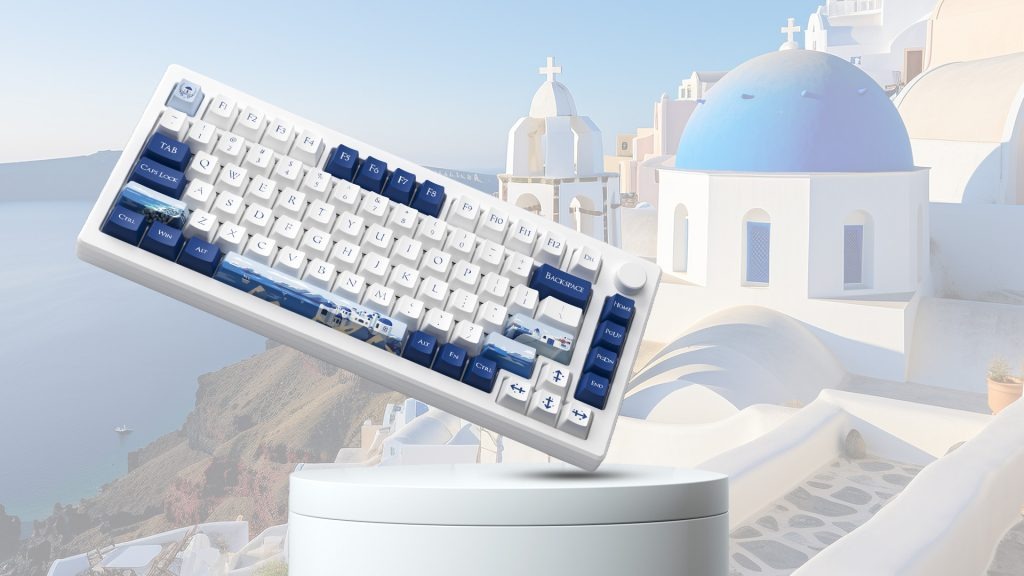 The Akko MOD007B-HE PC Santorini is a premium 75% layout mechanical keyboard inspired by the white and blue aesthetics of Santorini. It features high-performance magnetic (Hall-effect) Kailh Sakura Pink switches for precise actuation, multi-mode connectivity (USB-C wired, 2.4 GHz, Bluetooth 5.0), a gasket-mount structure for a smooth typing feel, full RGB lighting, and advanced gaming features such as Rapid Trigger and Dynamic Keystrokes for responsive input.