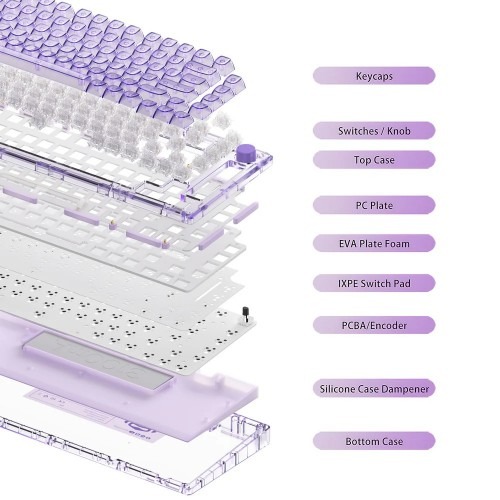 | Case / Keycaps | Transparent acrylic/PC case + clear PC keycaps |