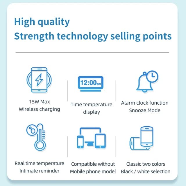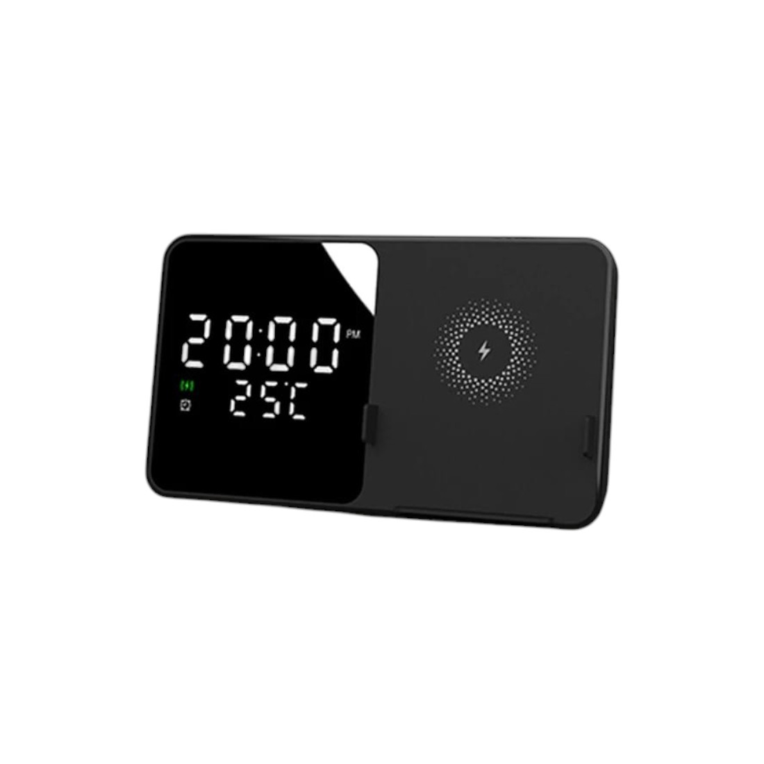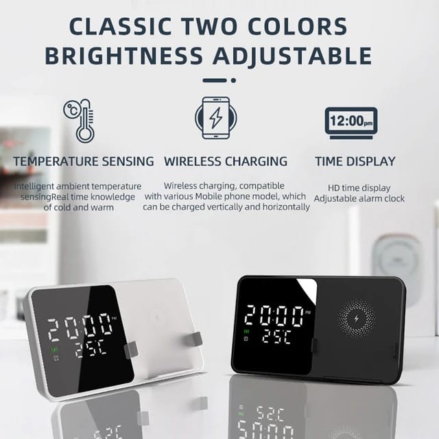 The Alarm Clock W5 Multifunction 15W Wireless Charger is a versatile bedside companion that combines a digital alarm clock, fast wireless charging, and a multifunctional LED display. With 15W Qi wireless charging, dual alarms, adjustable brightness, and smart temperature/humidity monitoring, it keeps your devices powered and your schedule organized. Its sleek design and compact footprint make it perfect for nightstands, desks, or offices.