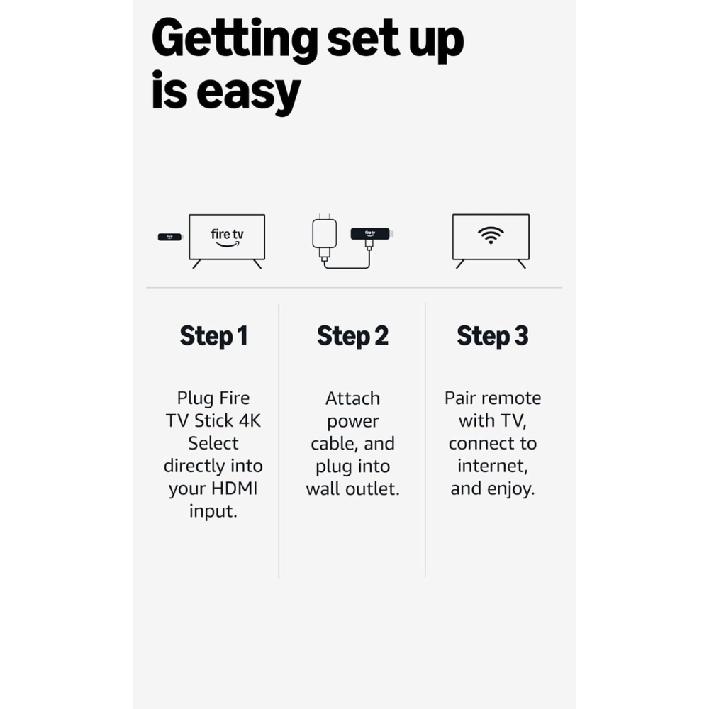 | Included | Fire TV Stick 4K Select, Alexa Voice Remote, USB cable, power adapter, HDMI extender, user guide |