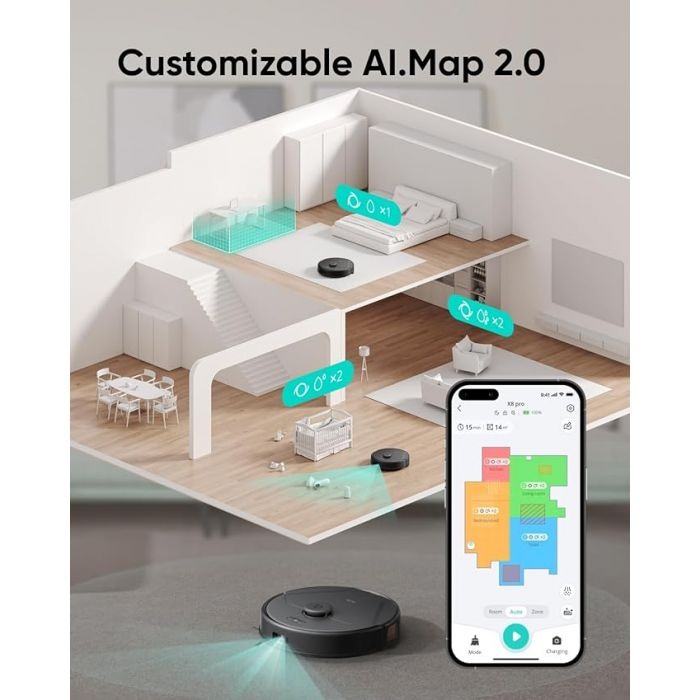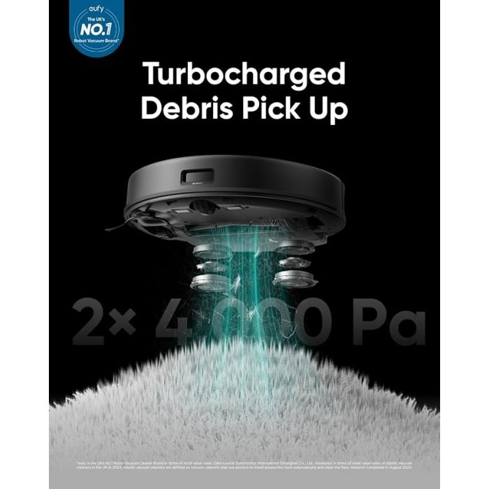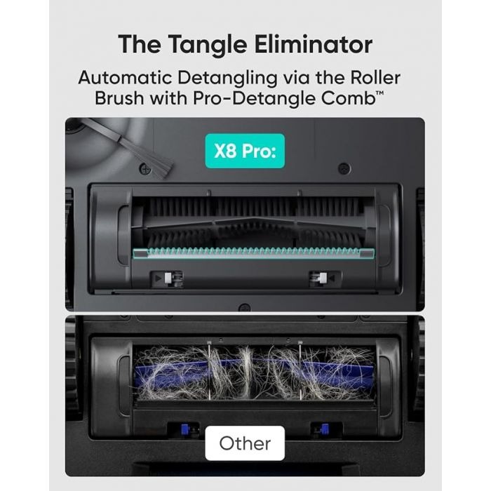 The eufy Clean X8 Pro SES B2B – Europe (Excluded UK Plug) Black Iteration 1 is a high-performance robot vacuum with dual-turbine suction (2 × 4,000 Pa) and an Active Detangling™ roller brush, designed for tangle-free cleaning on carpets and hard floors. It features an AI.Map™ 2.0 laser navigation system for accurate mapping, supports no-go zones, and works with the self-empty station that collects debris into a 2.5 L dust bag for extended hands-free cleaning.
