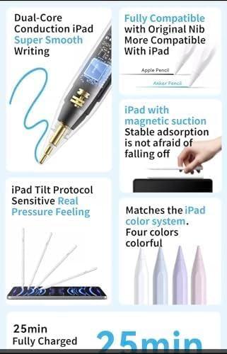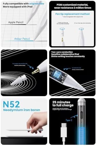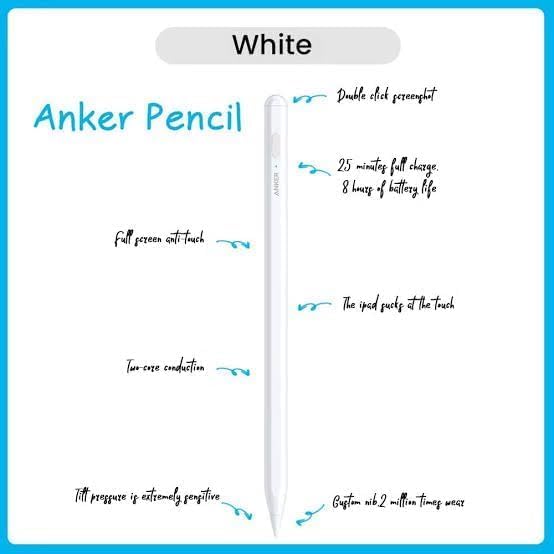 The ANKER Pencil Capacitive Stylus Pen (A7139P21) is a sleek, lightweight stylus designed for iPad users who want precision and ease in writing, drawing, or navigating. It features Bluetooth connectivity, tilt-sensitivity for natural slanted strokes, magnetic attachment to compatible iPads, and fast USB-C charging. Its aluminium-alloy body and wear-resistant tip provide a premium feel and practical portability.