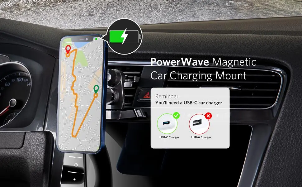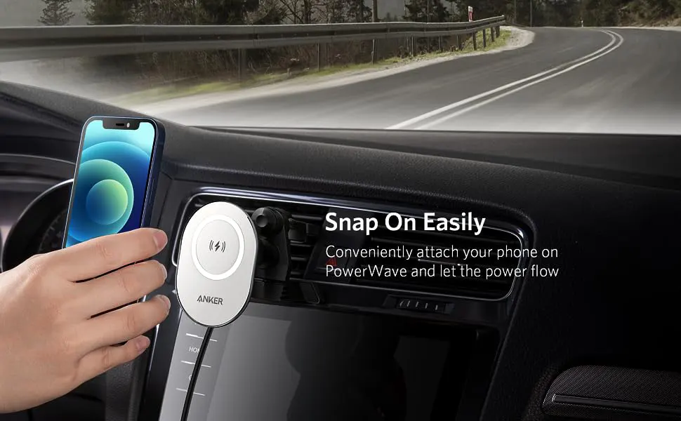 The Anker PowerWave Magnetic Charging Car Mount (A2931HW1) combines magnetic phone mounting with fast wireless charging in a compact, secure design. Made for MagSafe-compatible iPhones and magnetic cases, it attaches easily to your car’s air vent and provides up to 7.5W of wireless charging. The strong built-in magnets ensure your phone stays in place even on bumpy roads, while the adjustable viewing angle keeps navigation clear and convenient.