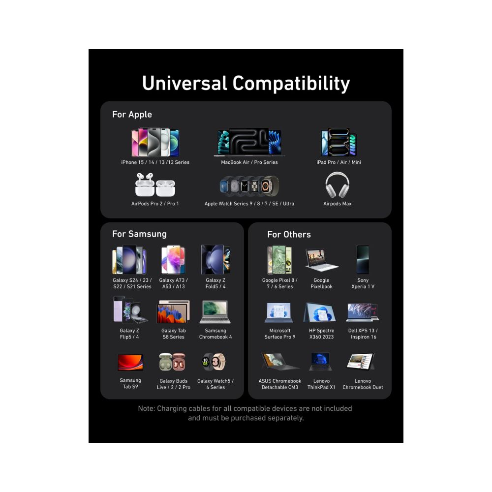 Dual-Port Output | Total 100 W max. Sample allocations: • USB‑C1 + USB‑C2 = 65 W + 35 W • USB‑C1 + USB‑A = 65 W + 22.5 W • USB‑C2 + USB‑A = 12 W + 12 W (24 W) |