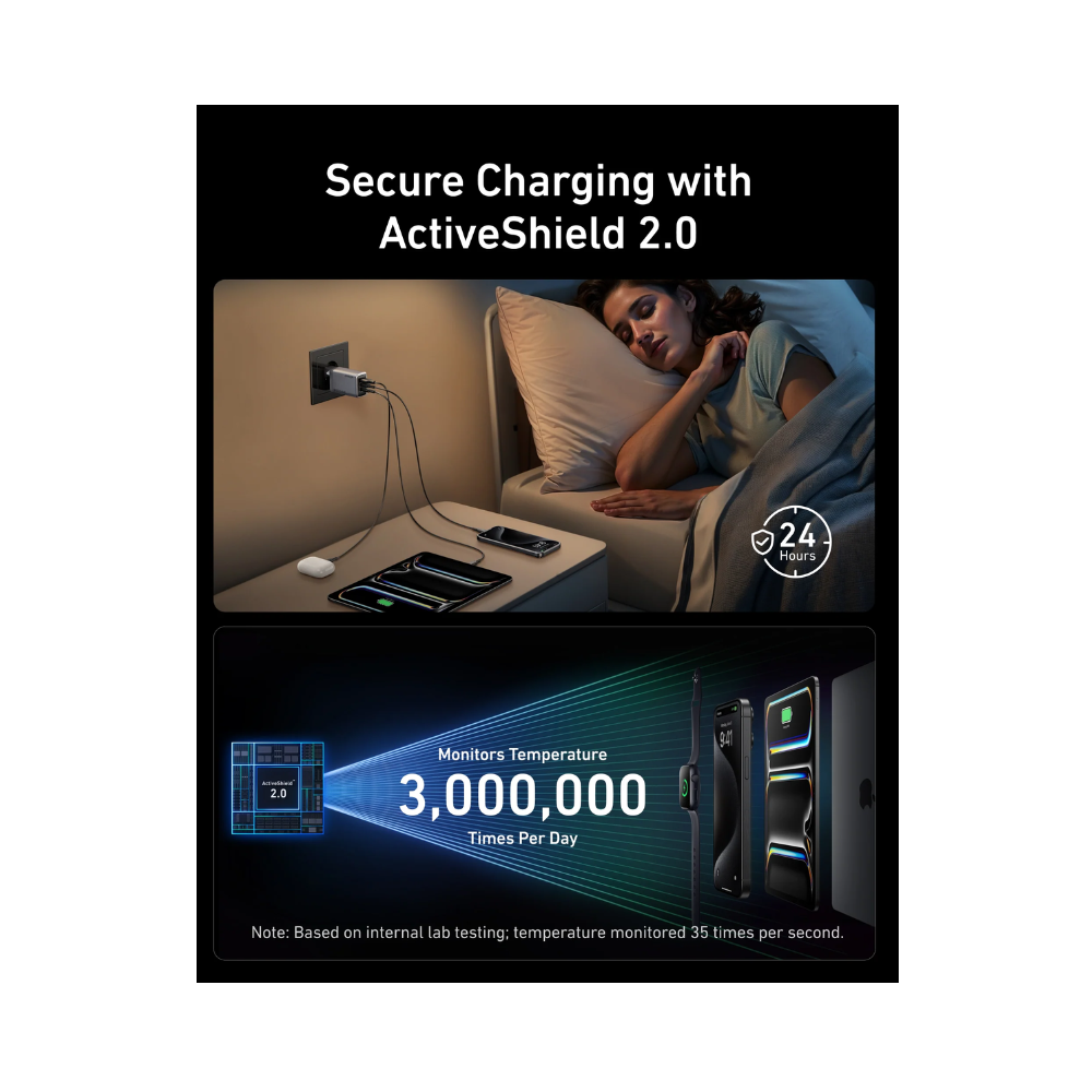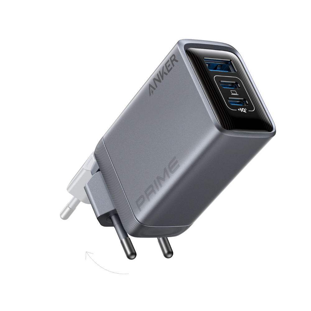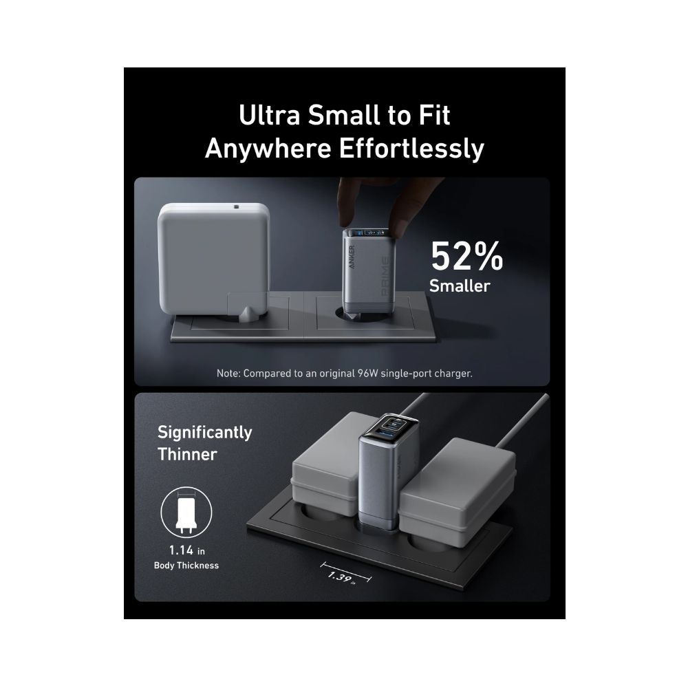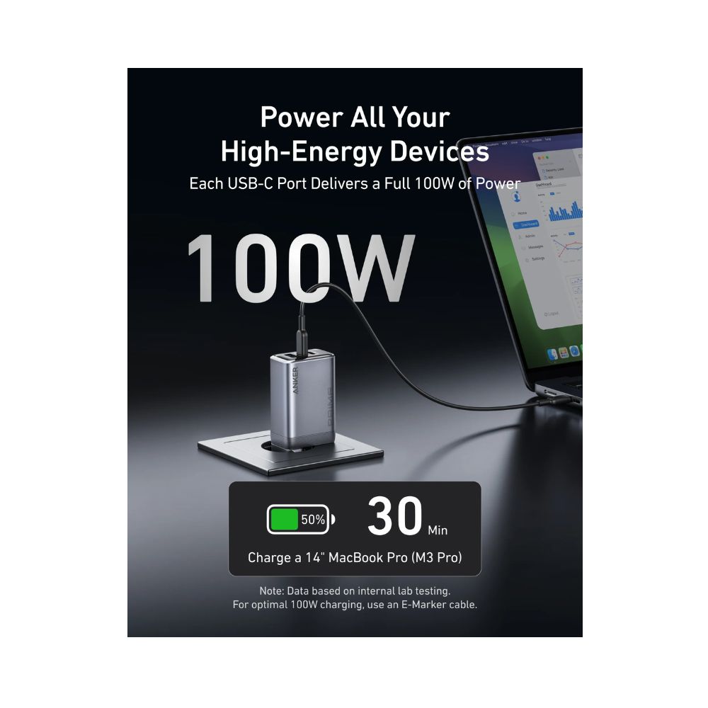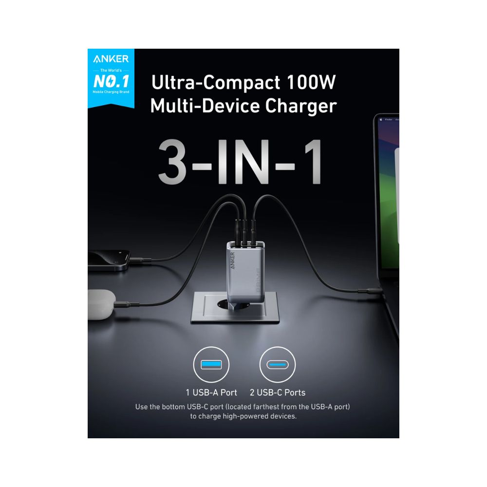The Anker GaN Charger 100 W 3‑Ports (Model A2688341) in a refined Dark Gray finish utilizes cutting-edge **GaNPrime™ technology for ultra-compact and efficient charging. With two USB‑C ports and one USB‑A port, it delivers up to **100 W** when a single USB‑C port is used, and intelligently allocates power across devices—up to **89 W total**—when all three ports are active. Enhanced with **ActiveShield™ 2.0**, it monitors temperature and power output up to 3 million times per day to ensure safe and reliable performance. The charger’s vertical stacked port layout and reinforced prongs offer greater stability in outlets, making it ideal for home, office, or travel use.