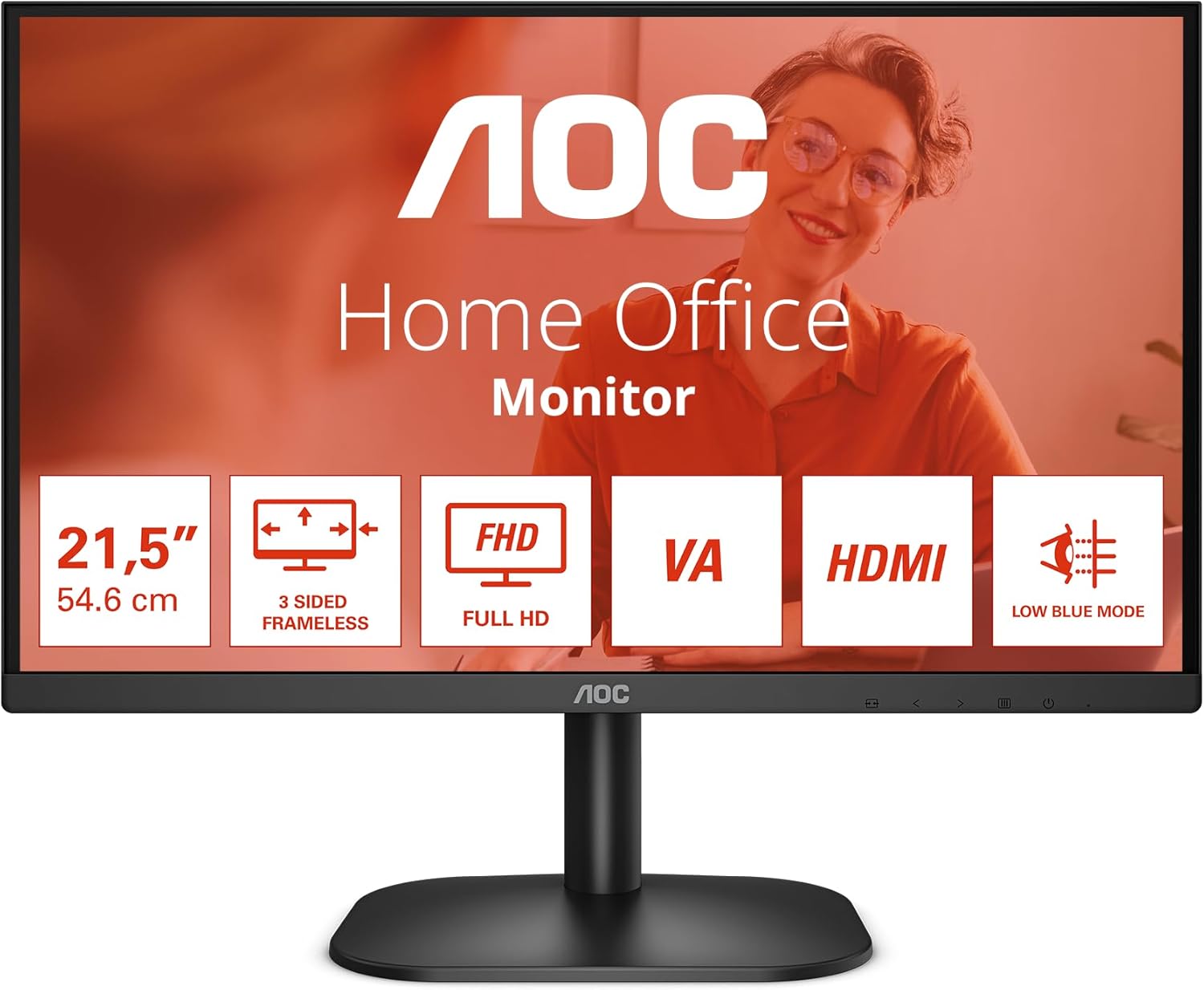 The AOC 22E2HM FHD Monitor (22″) is a 21.5-inch monitor designed for everyday productivity, media consumption, and casual gaming. Featuring a VA panel with a matte finish, it delivers deep blacks and high contrast for clear, vibrant visuals. The monitor supports a **75Hz refresh rate** and incorporates **Adaptive Sync** technology to reduce screen tearing, ensuring smooth motion for videos and light gaming. Its ergonomic tilt and VESA mount compatibility provide flexible installation options. Connectivity includes HDMI 1.4 and VGA inputs, with a 3.5 mm audio output for headphones. The monitor also offers flicker-free and low blue light modes for comfortable viewing over extended periods.
