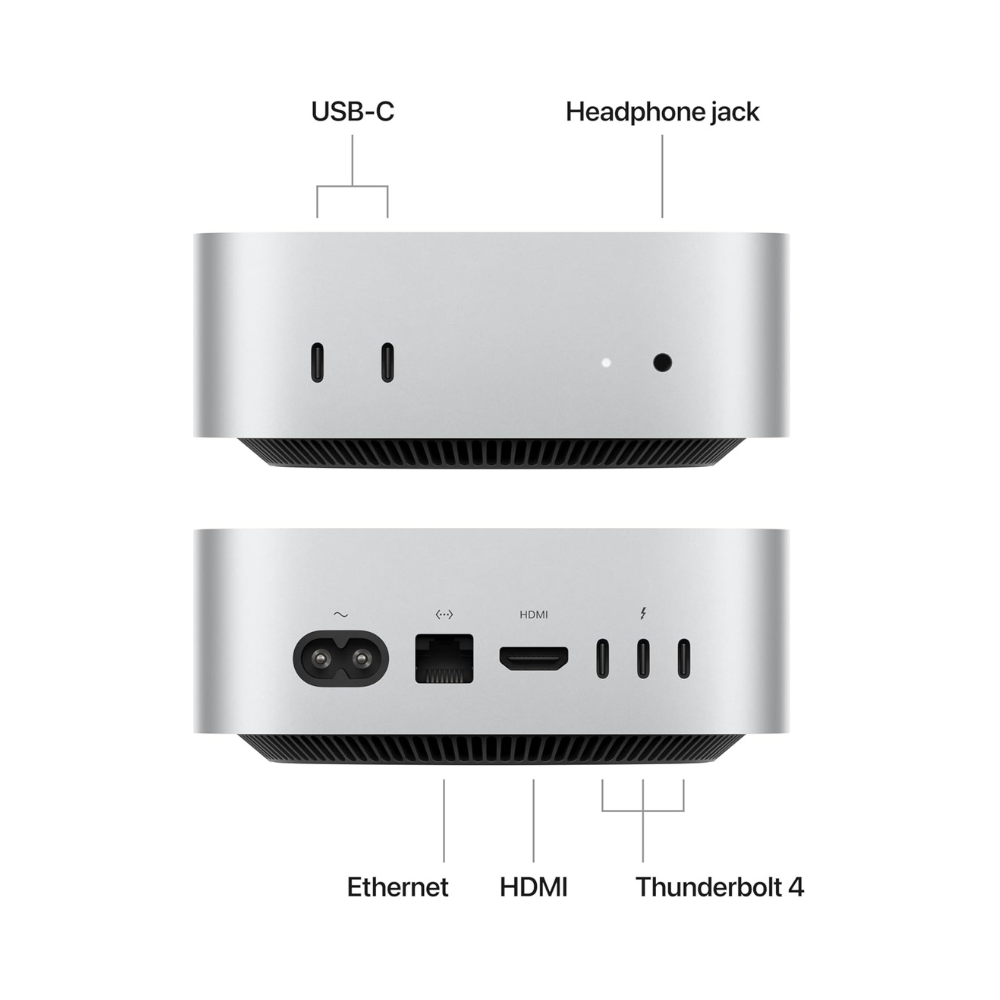 The Apple Mac Mini M4 (256GB SSD/16GB RAM) is a compact yet powerful desktop computer designed to deliver professional-grade performance in a sleek silver chassis. Equipped with the Apple M4 chip, it features a 10-core CPU (4 performance cores, 6 efficiency cores), 10-core GPU with hardware-accelerated ray tracing, and a 16-core Neural Engine, providing seamless multitasking, rapid processing, and advanced graphics rendering. With 16GB of unified memory and a 256GB SSD, the Mac Mini M4 is optimized for creative professionals, developers, and productivity users seeking high performance in a small form factor. It supports up to three external displays, HDR video playback, and advanced audio formats, while offering a wide array of connectivity options including Thunderbolt 4, USB-C, HDMI, Wi-Fi 6E, Bluetooth 5.3, and Ethernet. macOS and Apple Intelligence enhance productivity, security, and personalization, making this Mac Mini a versatile and intelligent desktop solution.