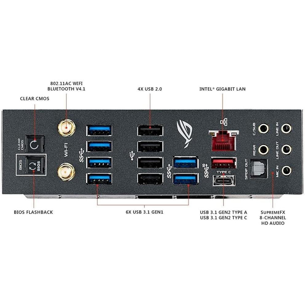 USB / I/O PortsBack panel: USB 3.1 Gen2 (Type‑A + Type‑C), USB 3.1 Gen1 ports, USB 2.0; Internal: USB 3.1 (front panel) + headers, BIOS FlashBack support