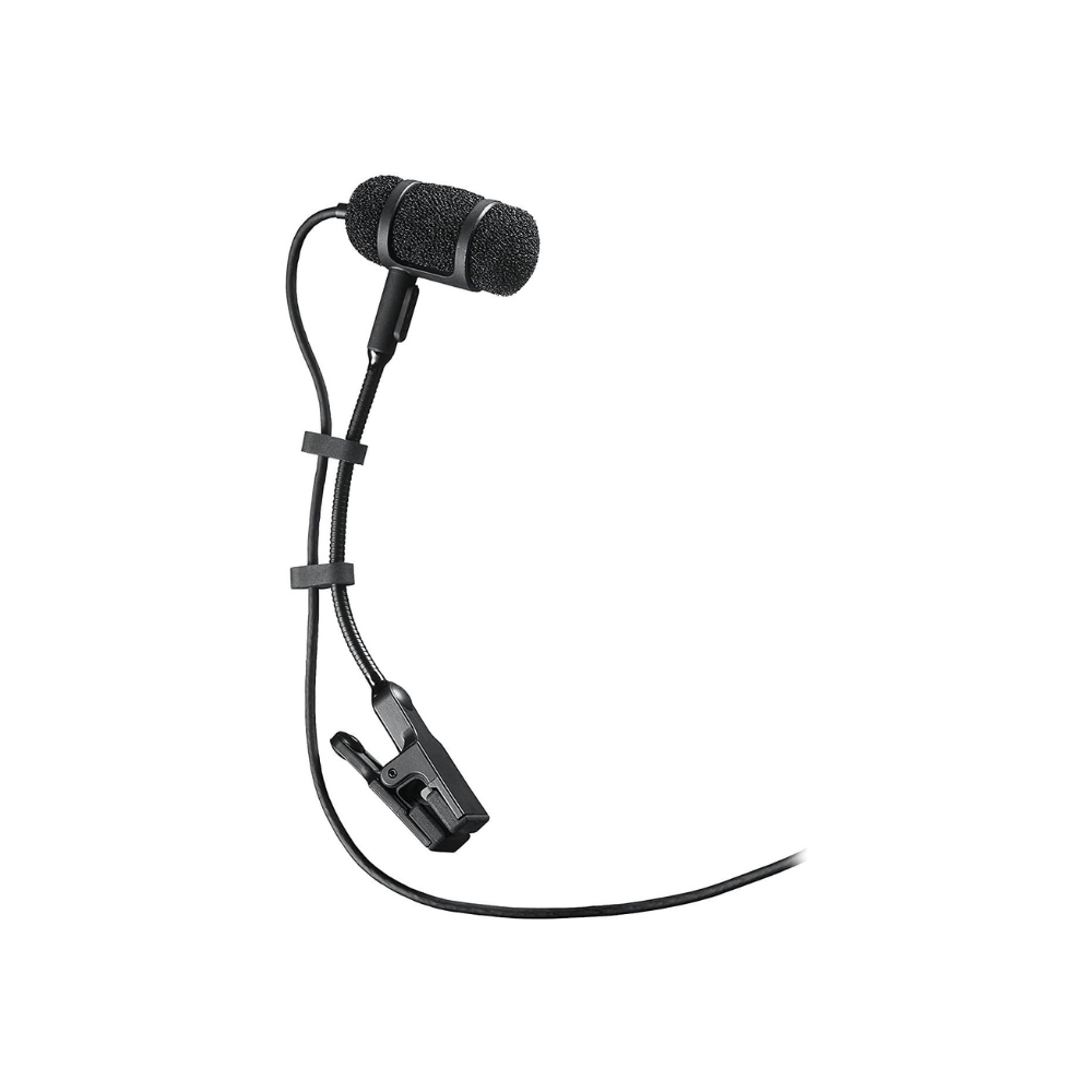 The Audio‑Technica PRO35 is a compact clip‑on condenser microphone designed to deliver detailed, reliable pickup for instruments — especially brass, woodwinds, percussion (toms, snare, etc.), sax/clarinet, or other high‑SPL sources. Its small, lightweight condenser capsule and cardioid pickup pattern allow you to clip it directly onto the instrument (via the included UniMount® clip), providing close, isolated capture of the instrument’s sound while minimizing bleed and unwanted ambient noise. The PRO35 handles high sound pressure levels cleanly — ideal for live stage performance, rehearsal, or recording — and includes a power module with an 80 Hz high‑pass (roll-off) filter to reduce low‑frequency rumble, mechanical noise, or handling / stage vibrations.