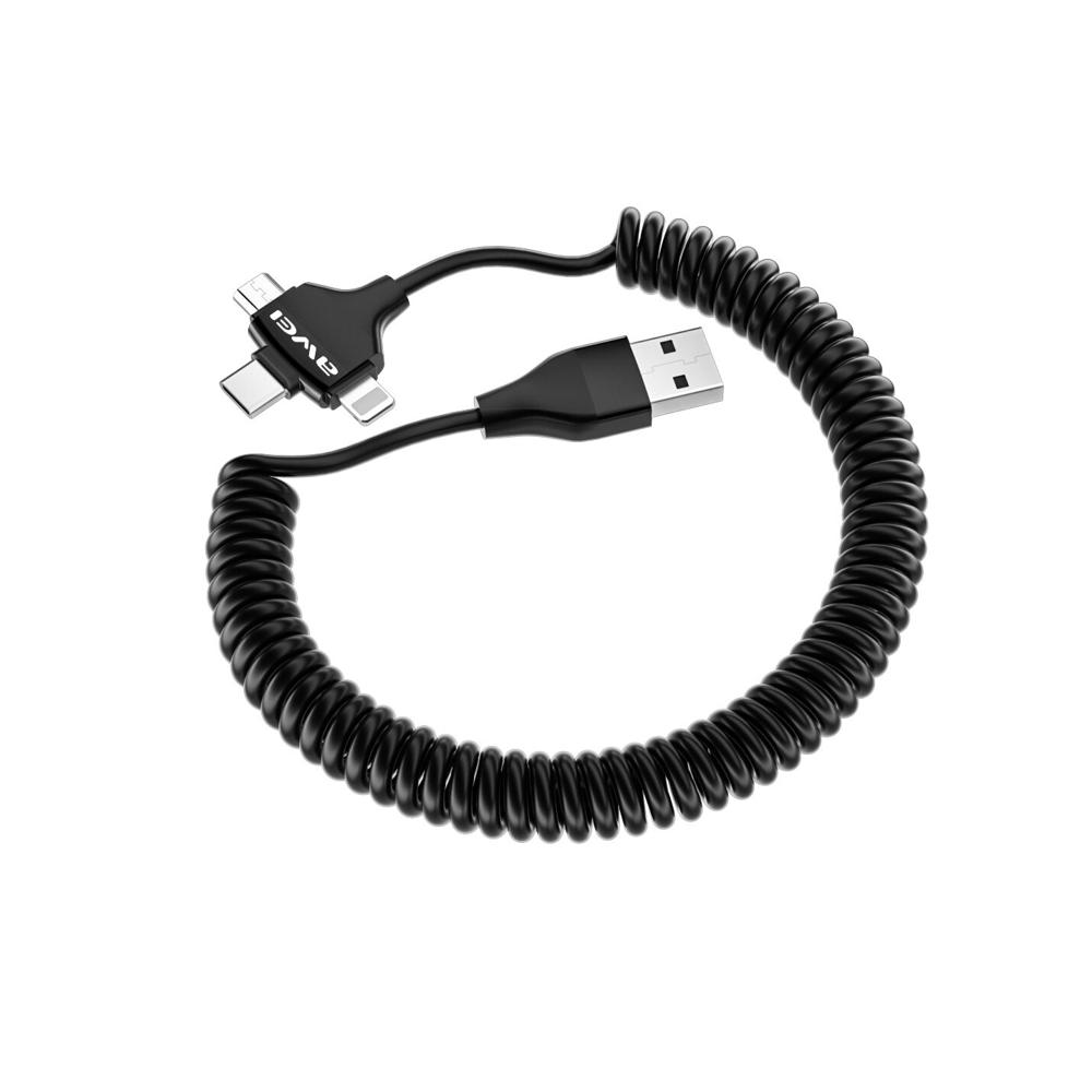 The AWEI 3in1 Spring Mobile Cable (CL-205) is a versatile charging solution for multiple devices. Featuring a spring-like design and three connector types (USB-C, Lightning, and Micro-USB), it allows you to charge smartphones, tablets, and other devices conveniently with a single cable. Its durable construction ensures long-lasting performance, while the flexible spring design prevents tangling and enhances portability.