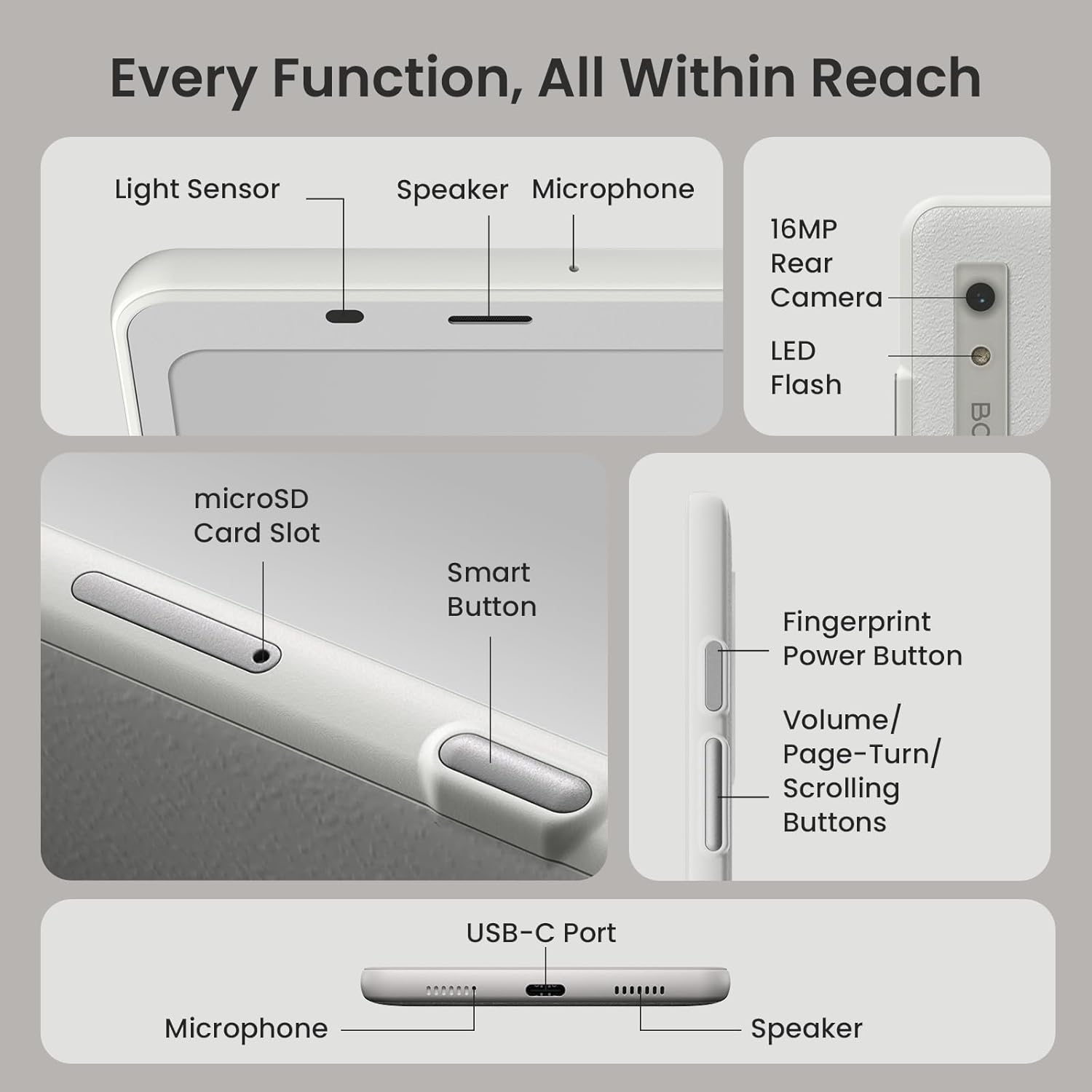 The BOOX Palma 2 Mobile (6.13″) is a compact E-Ink reader and Android-powered mobile e-paper device that fits comfortably in one hand. Its 6.13″ HD Carta 1200 touchscreen delivers crisp 300 ppi black-and-white clarity ideal for reading ebooks, articles, documents, and web content. Palma 2 runs Android 13, supports third-party apps, and adds a modern convenience with a fingerprint sensor integrated into the power button for secure, one-touch unlocking. Featuring dual microphones, a built-in speaker, and a 16 MP rear camera with LED flash, it’s versatile for reading, voice notes, and capturing documents on the go.