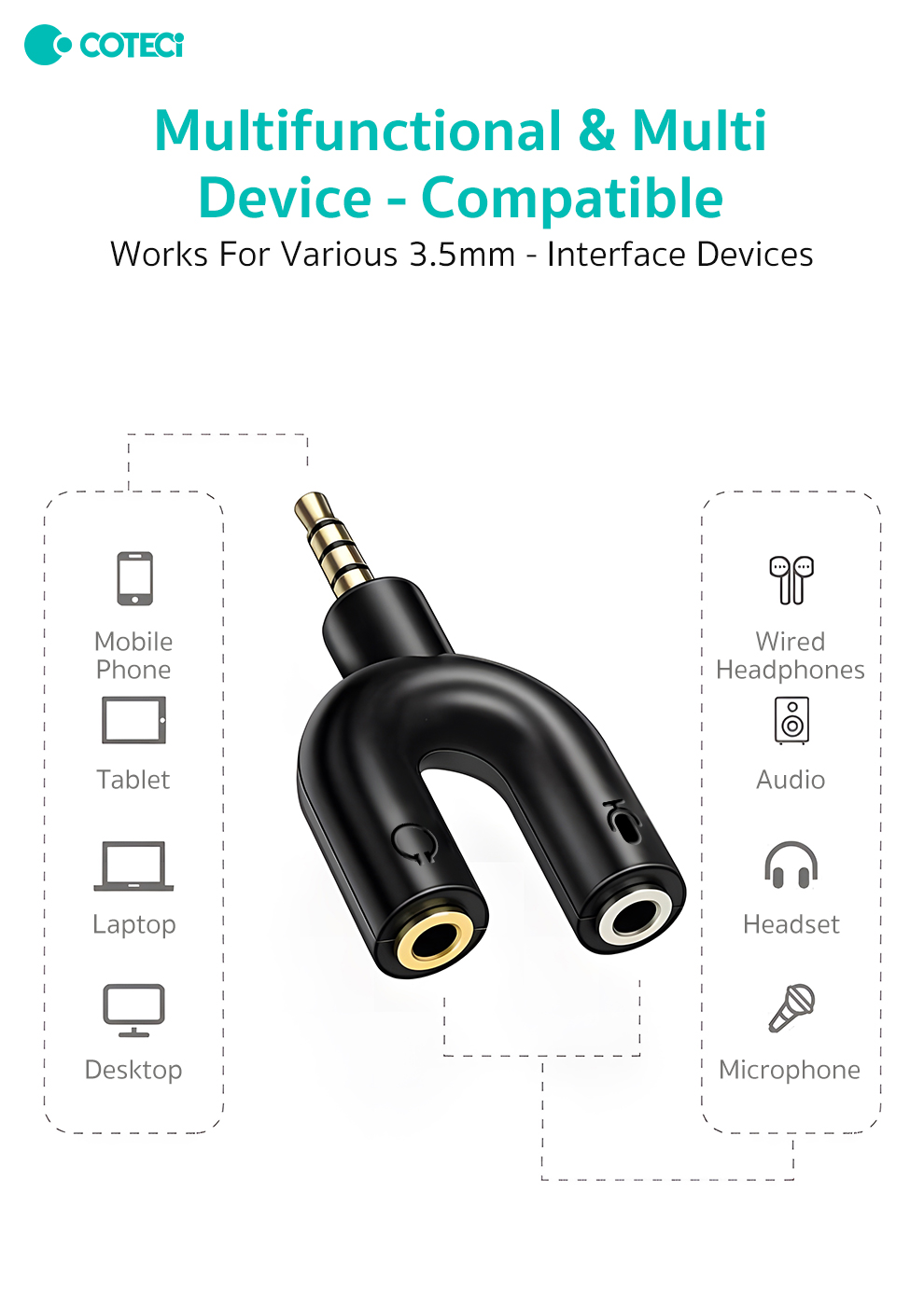 | Connectivity | Splits one 3.5 mm output into two headphone/speaker outputs |