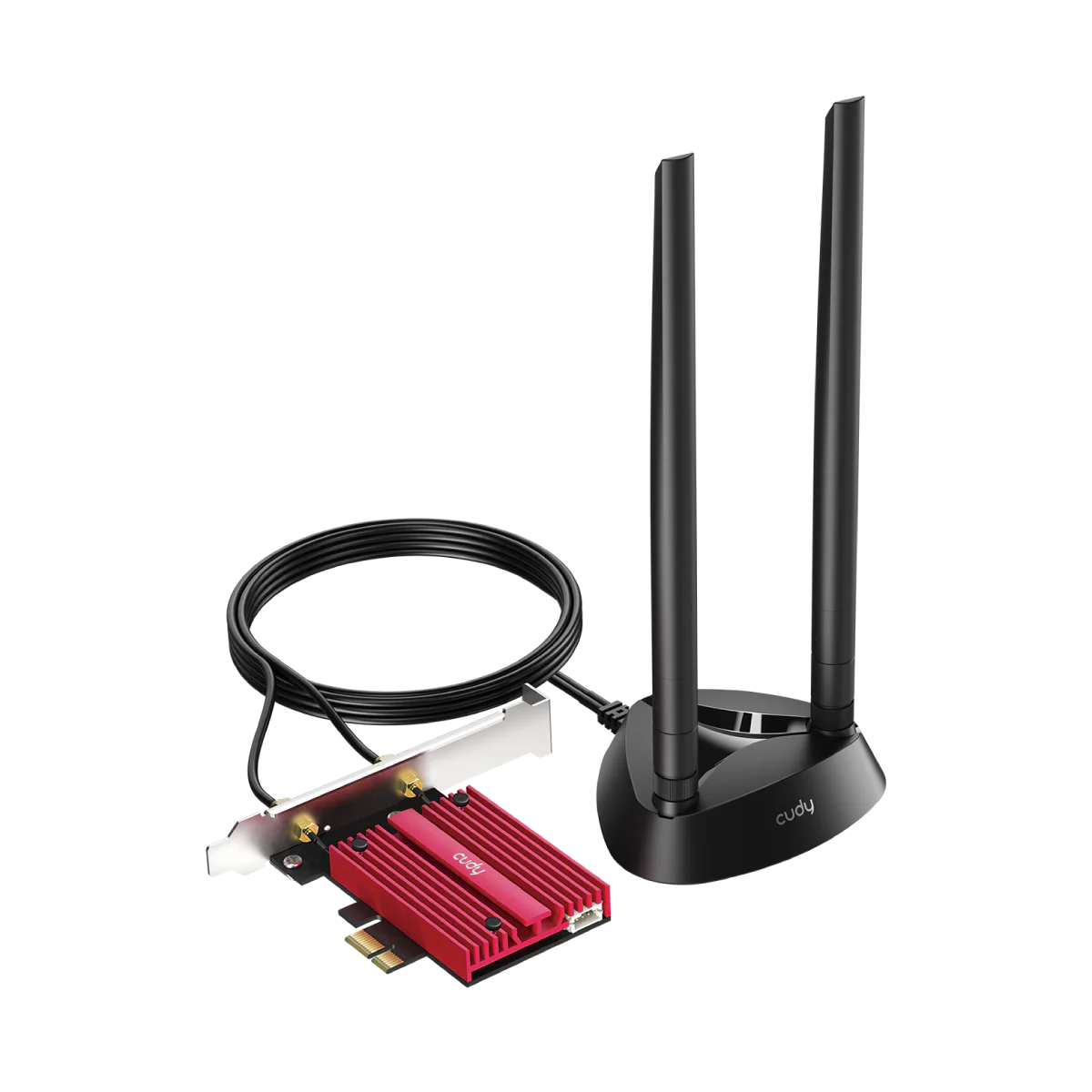 The Cudy Wi‑Fi 6E PCI‑E Adapter (WE4000) — model WE4000 2.0 — is a high-performance network card for desktops, providing tri‑band Wi‑Fi 6E (6 GHz / 5 GHz / 2.4 GHz) and Bluetooth 5.3 connectivity. Designed for gaming, streaming, and heavy internet usage, it features detachable antennas with magnetic bases for optimal range and stable connections. The adapter supports OFDMA, MU‑MIMO, 160 MHz channels, WPA3 security, and high-speed Wi‑Fi 6E features for modern networking demands.