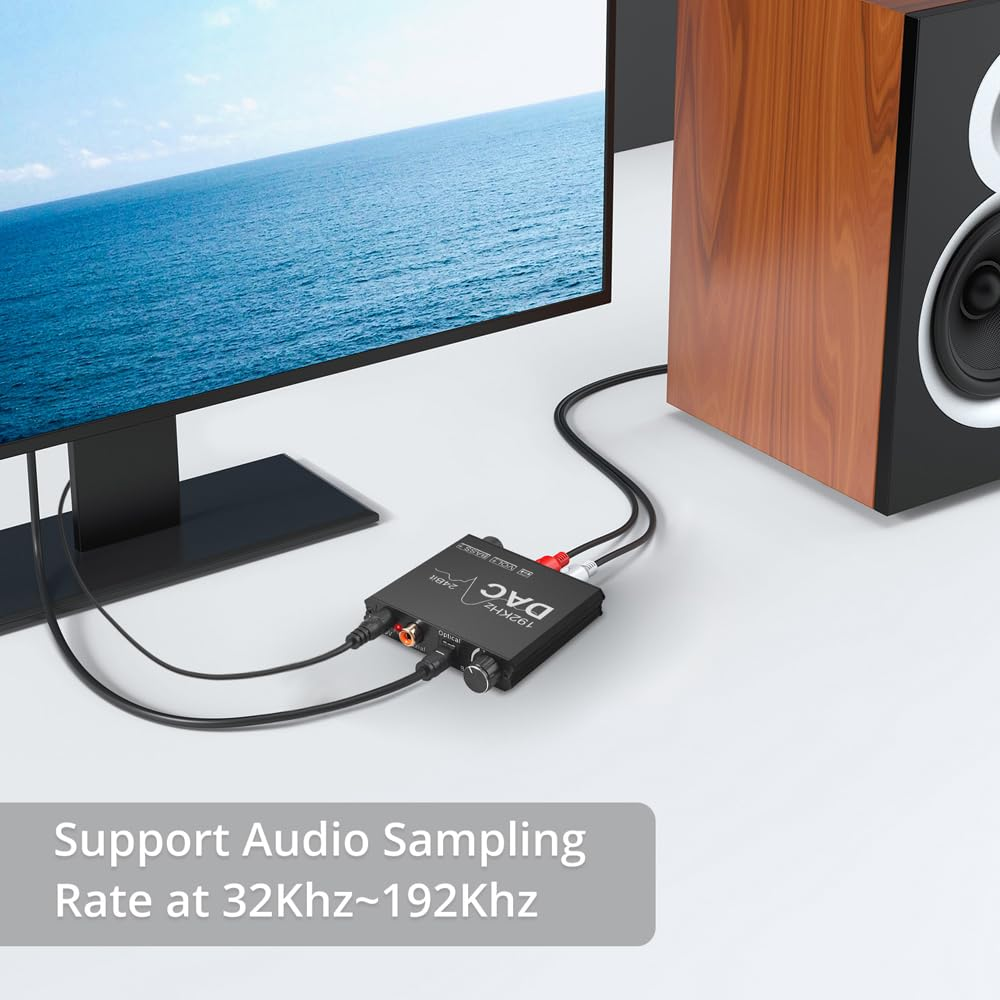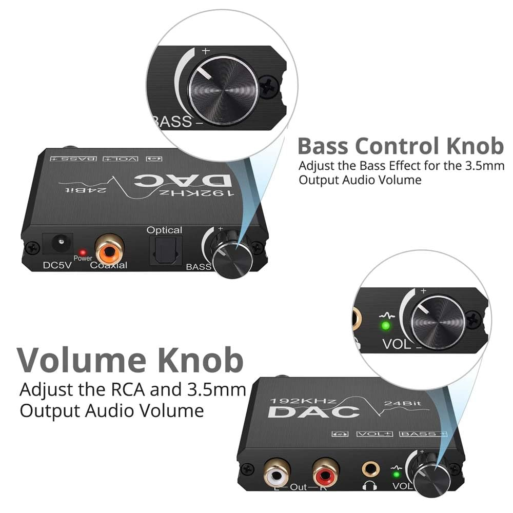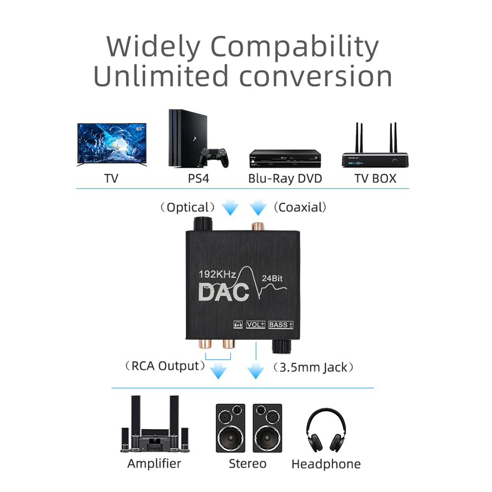 The DAC 192KHz 24Bit Digital to Analog Converter is a high-performance audio solution designed to deliver clean, detailed sound from your digital sources. Built for professional and home audio applications, this DAC easily converts digital Coaxial or Optical (Toslink) signals into analog RCA output and a 3.5mm headphone jack. Featuring a professional-grade audio amplifier chip, it can directly drive headphones while allowing precise volume control. The integrated bass adjustment knob lets you fine-tune low frequencies to suit your listening preference, all housed in a durable metal casing that minimizes interference for stable, noise-free audio output.