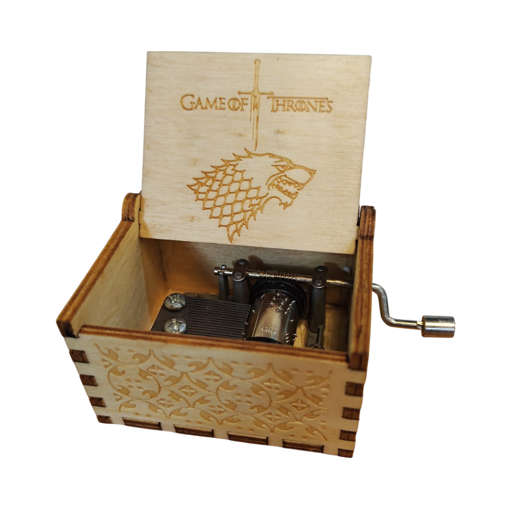 | Features | Manual hand-crank mechanism, engraved wooden detailing inspired by Game of Thrones, compact and portable size, plays the iconic Game of Thrones theme melody, ideal for collectors and fantasy series enthusiasts |
