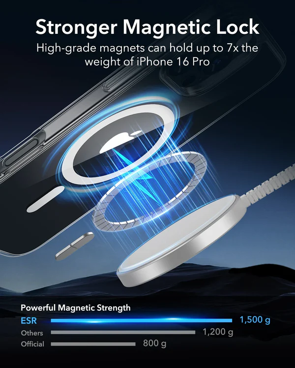 The ESR Classic Hybrid Case (HaloLock) with Screen Protection Set for the iPhone 16 Pro is a clear, all-in-one protection bundle that combines a rugged hybrid case with tempered glass screen protection. The hybrid case features a flexible TPU bumper and a rigid, scratch-resistant polycarbonate back that defends against drops and everyday wear while showcasing the phone’s design. Built-in HaloLock magnets enable secure magnetic alignment with MagSafe-compatible chargers and accessories, making wireless charging and attachment effortless without removing the case.