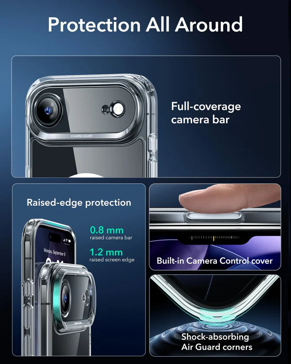 The ESR Classic Hybrid Magnetic Case (Camera Control) in Clear is a transparent protective case designed for the iPhone Air. It features an integrated magnetic ring that ensures reliable MagSafe alignment for stable wireless charging and secure attachment to MagSafe accessories. The hybrid construction combines a rigid acrylic back with shock-absorbing TPU edges for dependable everyday protection and raised borders to guard the screen and camera. The dust-proof camera control cover provides responsive tactile access, keeping the camera controls easy to use while offering added protection. Anti-yellowing materials help maintain the case’s clarity over extended use.