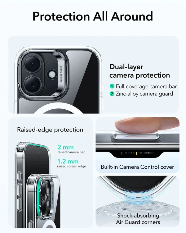 The ESR Clear MagSafe iPhone 17 Camera Control Case – Classic Hybrid is a transparent, hybrid protective case crafted for the iPhone 17. It features an integrated magnetic ring for seamless MagSafe alignment with chargers and accessories, plus a dust‑free camera control cover for responsive tactile access. The case’s hybrid construction combines a robust acrylic back and shock‑absorbing edges to deliver dependable everyday protection while maintaining a slim profile that showcases the phone’s original design. It offers military‑grade drop resistance and supports fast wireless charging without removing the case.