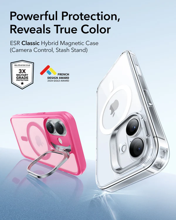The ESR Clear MagSafe iPhone 17 Camera Control Case – Classic Hybrid is a transparent, hybrid protective case crafted for the iPhone 17. It features an integrated magnetic ring for seamless MagSafe alignment with chargers and accessories, plus a dust‑free camera control cover for responsive tactile access. The case’s hybrid construction combines a robust acrylic back and shock‑absorbing edges to deliver dependable everyday protection while maintaining a slim profile that showcases the phone’s original design. It offers military‑grade drop resistance and supports fast wireless charging without removing the case.