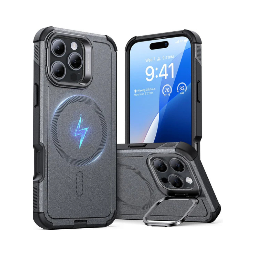 The ESR Cyber Tough Case with Stash Stand (HaloLock) for the iPhone 16 Pro is a rugged protective case engineered for **maximum defense and everyday convenience**. Built with a **three-layer structure** that combines a shock-absorbing interior, impact-resistant TPU, and a hard PC shell, it offers **military-grade level protection** to help shield your phone from drops, bumps, and daily wear. The built-in **HaloLock magnetic array** ensures secure alignment with MagSafe-compatible chargers and accessories while maintaining reliable wireless charging support. A standout feature is the **integrated Stash Stand**, which unfolds to prop your phone at various angles for comfortable **hands-free viewing** in both portrait and landscape modes — perfect for watching videos, video calls, or reading. Reinforced corners and raised lips around the screen and camera add extra defense against impacts, making this case ideal for users who want tough protection without sacrificing MagSafe convenience.