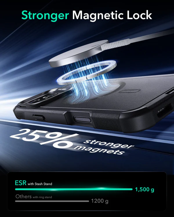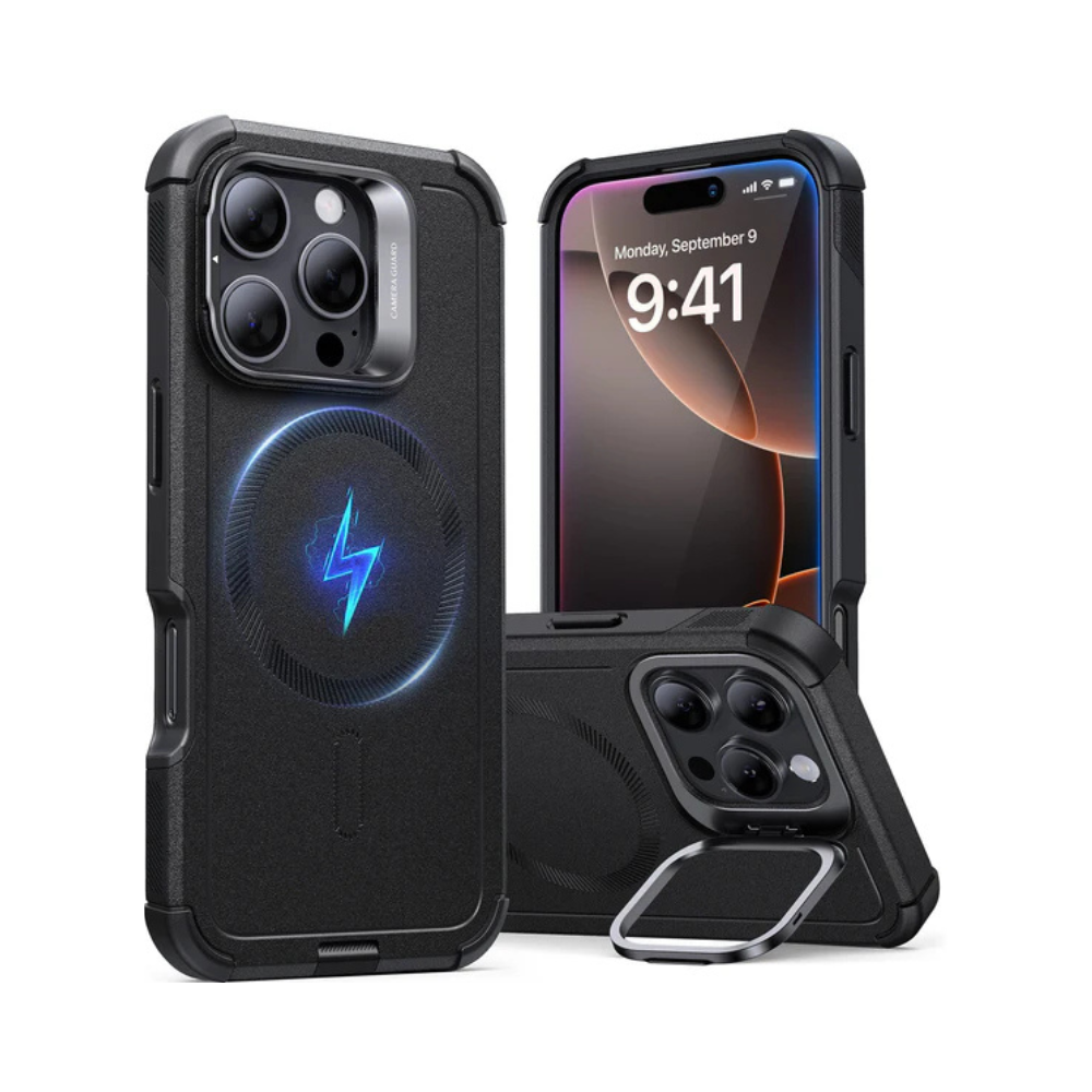The ESR Cyber Tough Case with Stash Stand (HaloLock) for the iPhone 16 Pro is a rugged protective case engineered for **maximum defense and everyday convenience**. Built with a **three-layer structure** that combines a shock-absorbing interior, impact-resistant TPU, and a hard PC shell, it offers **military-grade level protection** to help shield your phone from drops, bumps, and daily wear. The built-in **HaloLock magnetic array** ensures secure alignment with MagSafe-compatible chargers and accessories while maintaining reliable wireless charging support.