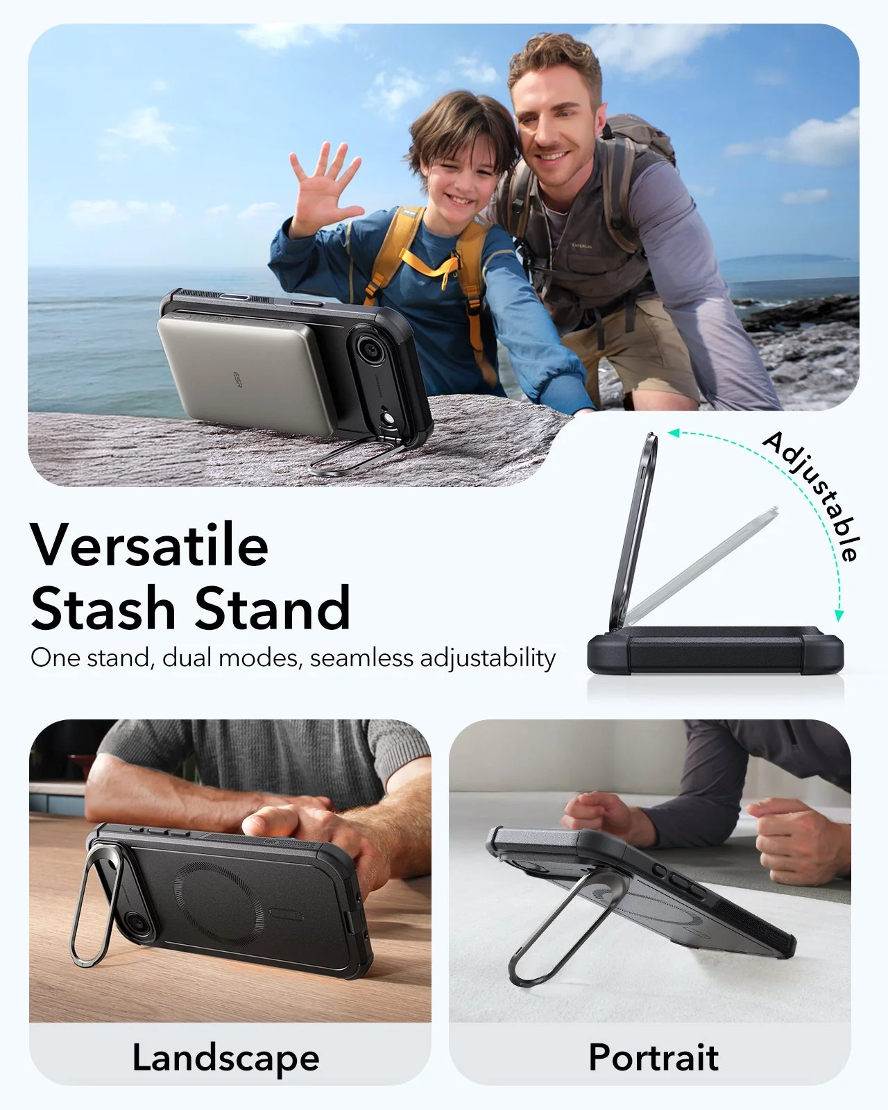 The ESR Cyber Tough Magnetic Case (Camera Control, Stash Stand) in Black is a rugged protective case built for the iPhone Air. It uses a robust three‑layer structure with a shock‑absorbing inner core, flexible TPU frame, and hard outer shell to deliver military‑grade drop resistance and all‑around defense. The built‑in magnetic ring ensures secure MagSafe alignment for wireless charging and accessories, while the integrated camera control button cover provides responsive, tactile access. An adjustable Stash Stand flips out easily to support hands‑free viewing in both portrait and landscape modes—ideal for video watching, gaming, or video calls.