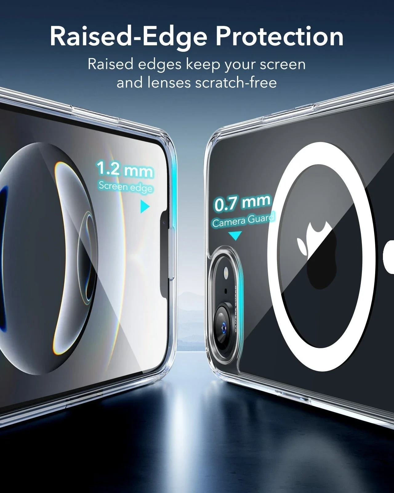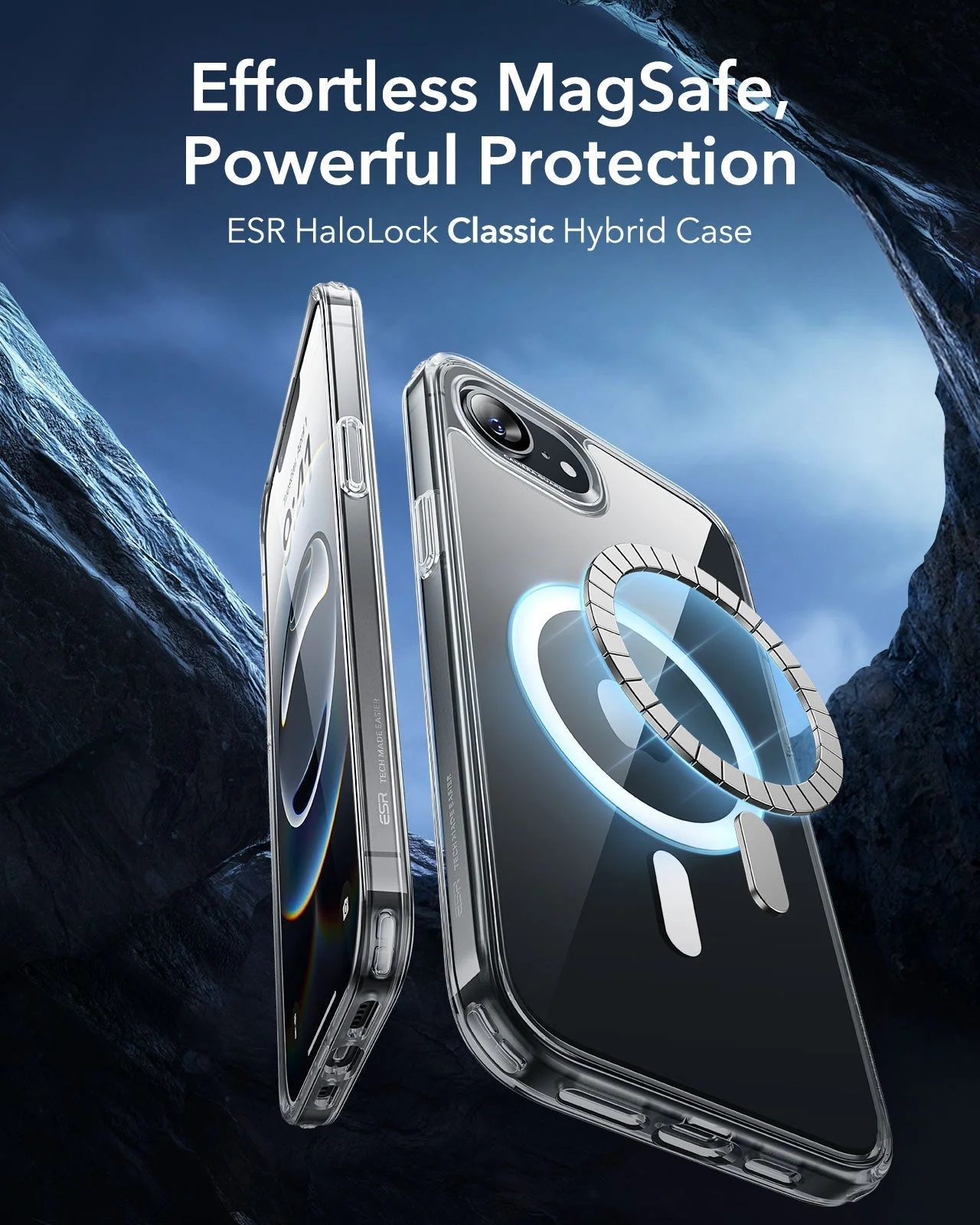 The ESR HaloLock Classic Hybrid Case for the iPhone 16e is a clear protective case that combines everyday defense with MagSafe‑style convenience. Its hybrid construction uses a flexible TPU bumper and a rugged, scratch‑resistant polycarbonate back to help protect your phone from drops, impacts, and daily wear, all while keeping the original design visible. Built‑in HaloLock magnets provide a secure magnetic connection with MagSafe‑compatible chargers and accessories without removing the case. The slim profile maintains the natural feel of the iPhone while offering reinforced corner protection and raised lips around the screen and camera areas for added defense against scratches and bumps. This clear finish keeps the color and look of your device on display, making it a practical and minimalistic choice for daily use.