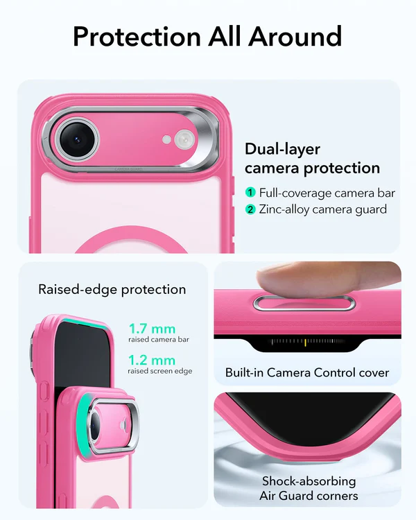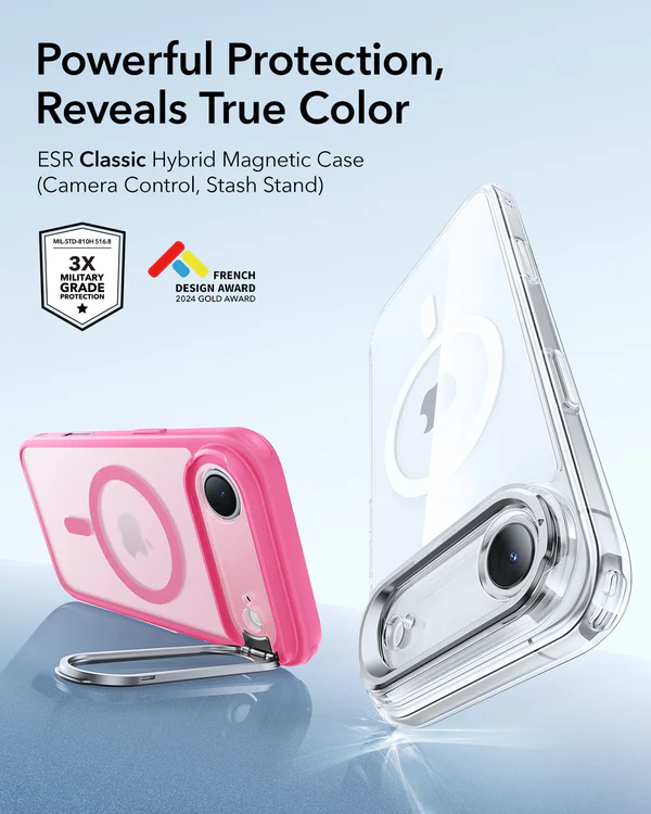 The ESR Classic Hybrid Magnetic Case (Camera Control, Stash Stand) in Frosted Blue is a versatile, transparent protective case made for the iPhone Air. It combines a hybrid build of clear acrylic and shock‑absorbing TPU with a built‑in magnetic ring for secure MagSafe alignment and fast wireless charging. A dust‑proof camera control cover delivers responsive tactile access, and the integrated Stash Stand lets you prop the phone up hands‑free for video viewing or calls. Tested to military‑grade drop standards, this case offers reliable everyday protection while keeping your device’s original design visible.