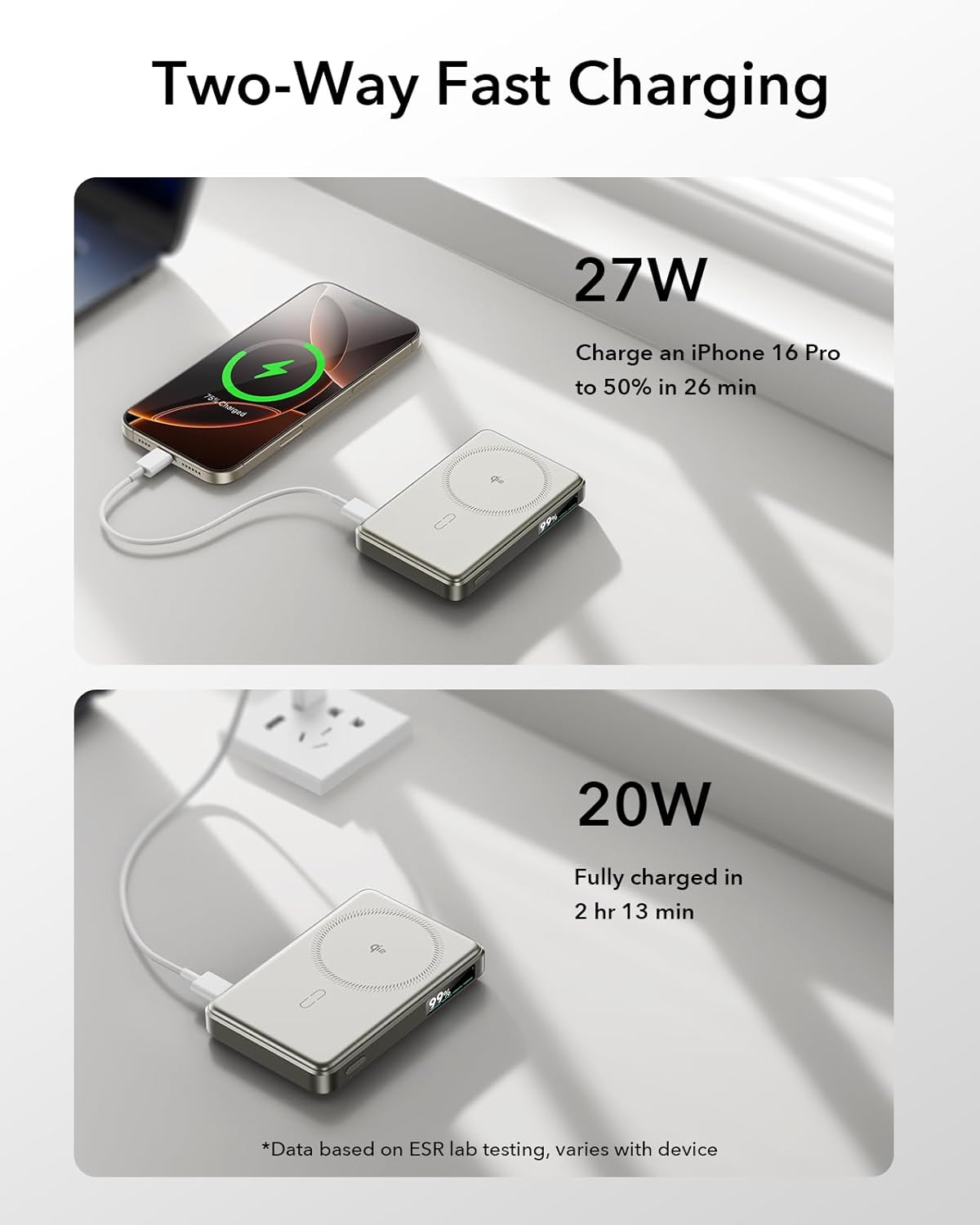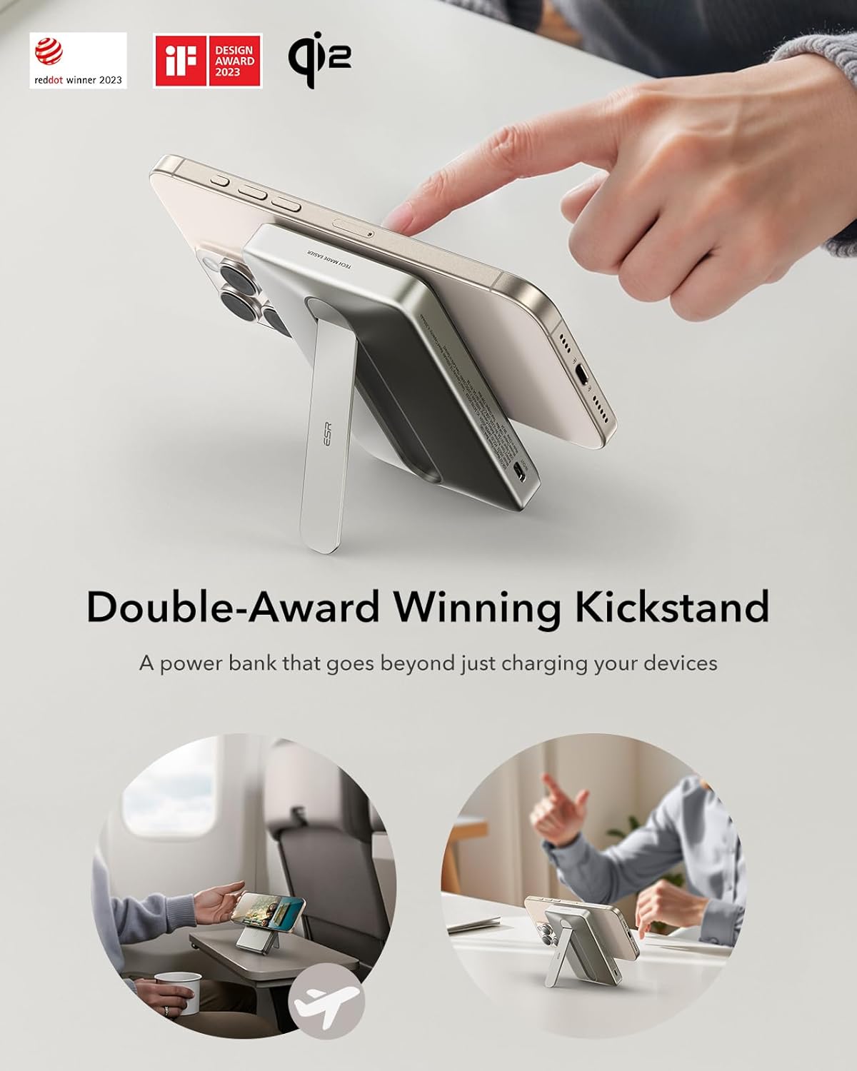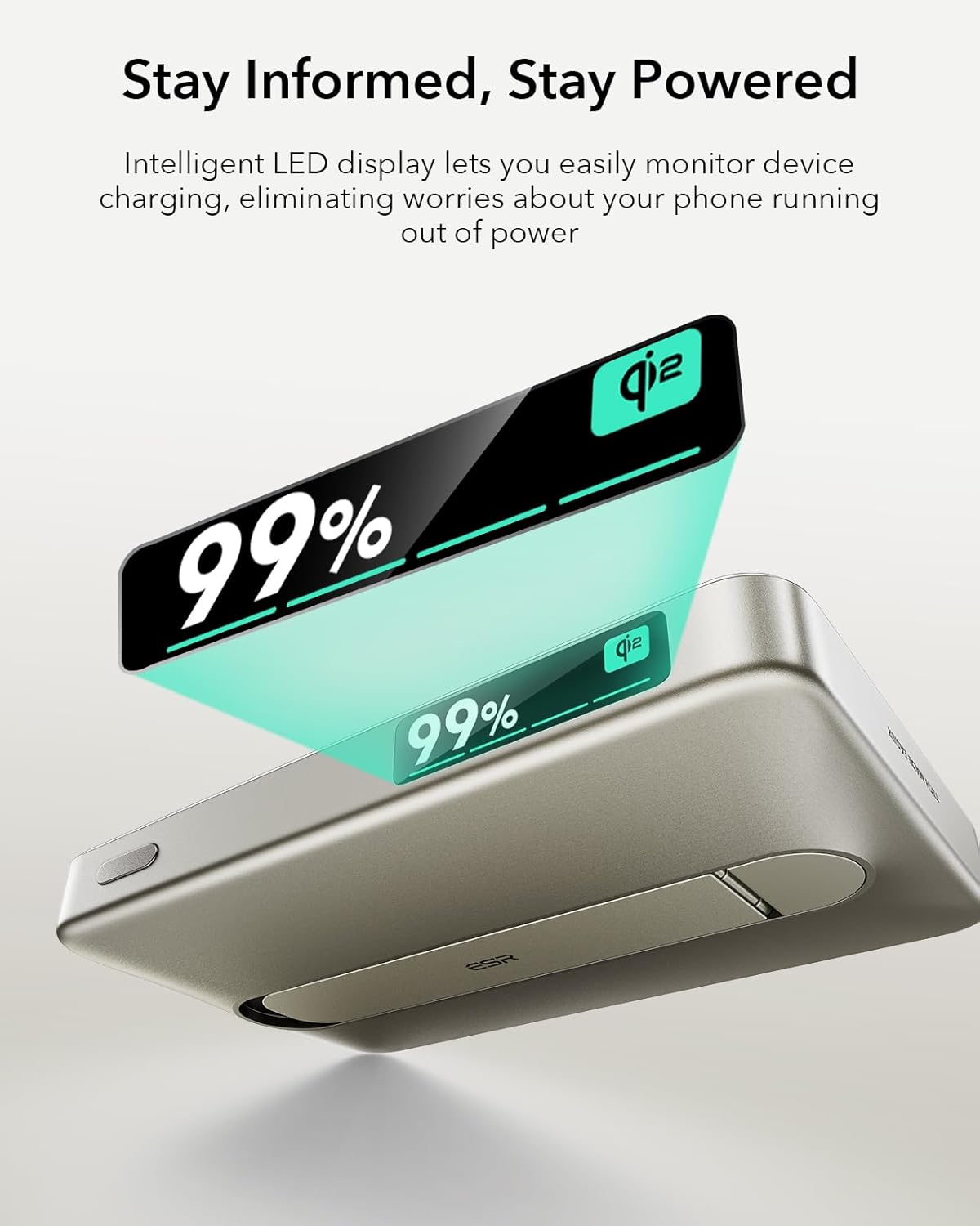 The ESR Qi2 MagSlim Kickstand Power Bank is a slim, portable charger offering 10,000 mAh capacity with Qi2-certified magnetic wireless charging for MagSafe-enabled iPhones. It features a built-in adjustable kickstand and compact design—ideal for travel and on-the-go use.