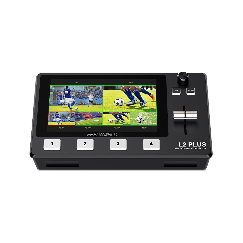 The FEELWORLD L2 Plus is a professional multi-camera video mixer and switcher with a built-in 5.5-inch touchscreen display for real-time monitoring and intuitive operation. Designed for streamers, video producers, and event professionals, it supports up to 4 HDMI inputs and provides live previews of PST and PGM outputs without the need for an external monitor. Featuring advanced Chroma Key effects, logo overlays, PTZ camera control, and USB 3.0 live streaming capabilities, the L2 Plus delivers studio-grade control in a compact and easy-to-use device.