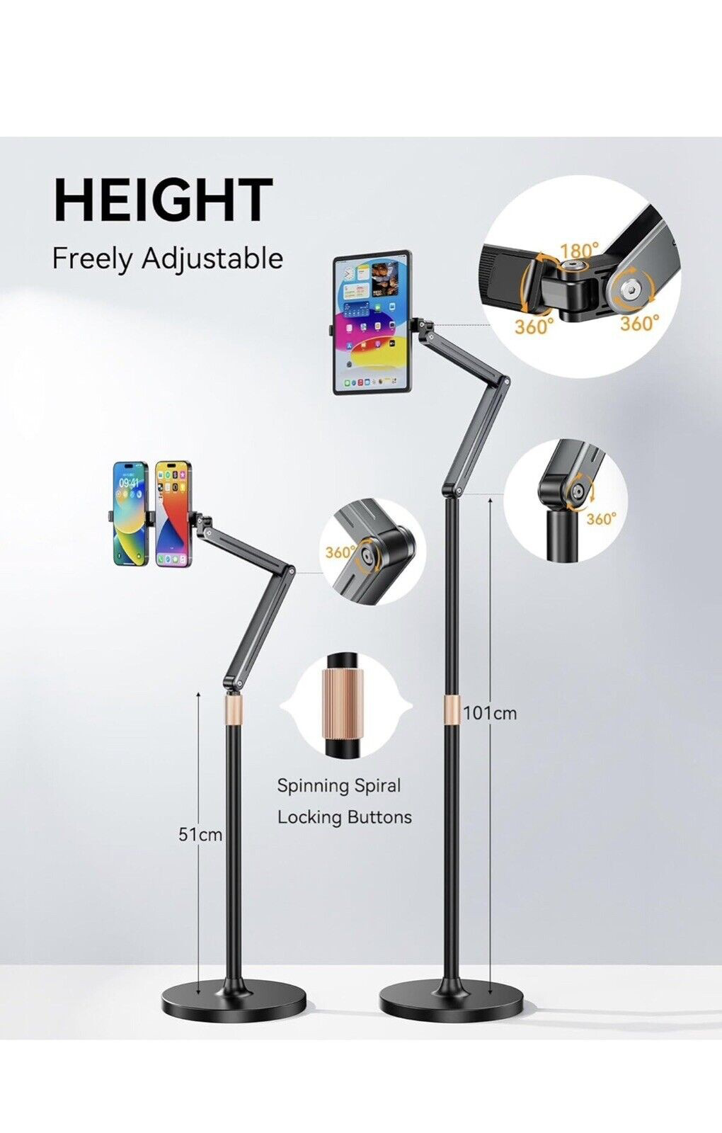 • Height Adjustable: Equipped with 60 cm (23.6 inches) to 160 cm (63 inches) height adjustment function, so that the mobile phone floor stand easily adapted to your various viewing positions, such as lying down, sitting, standing and so on.