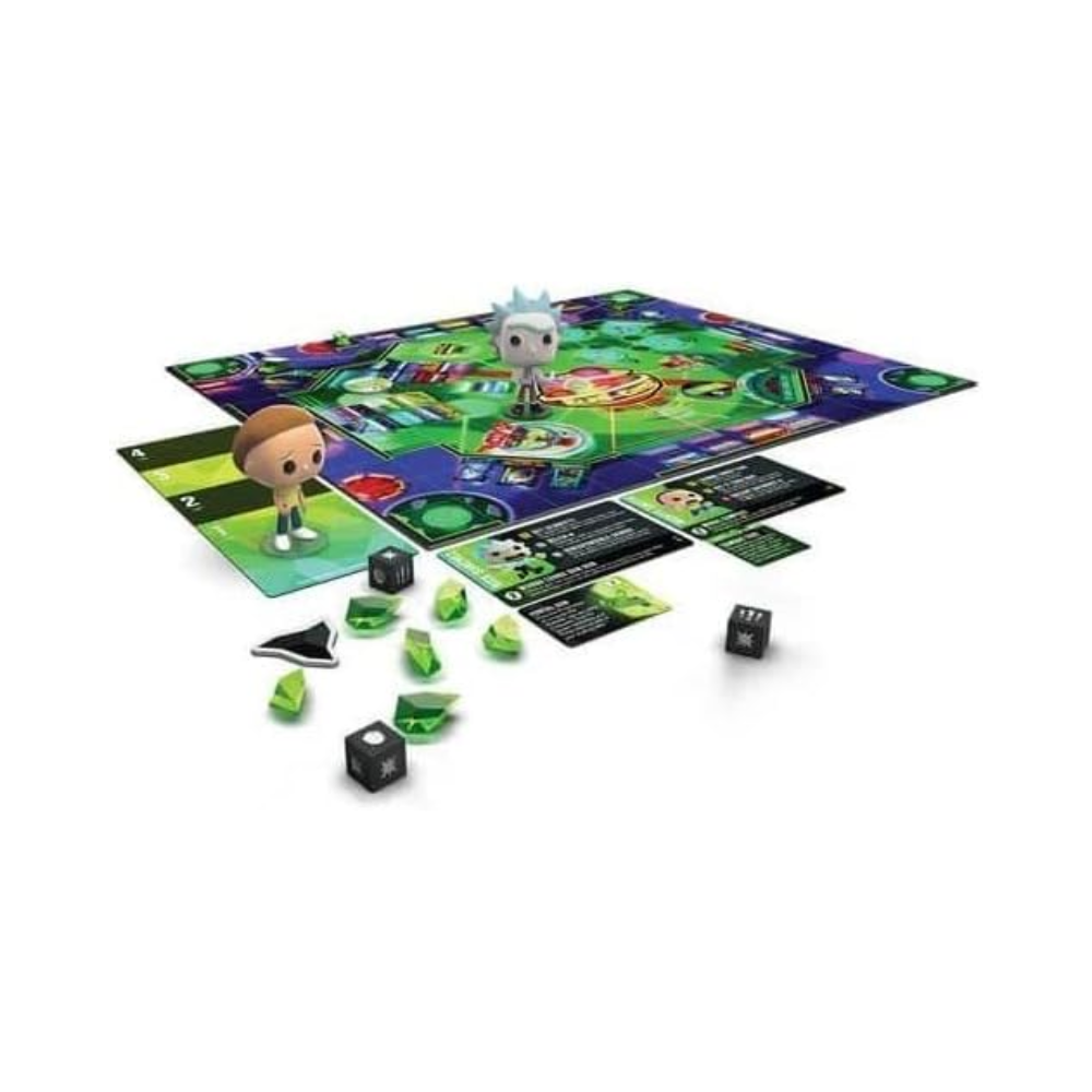 | Contents | Rick and Morty figures, double-sided boards, character and item cards, status tokens, dice, scenario guide, rulebook |