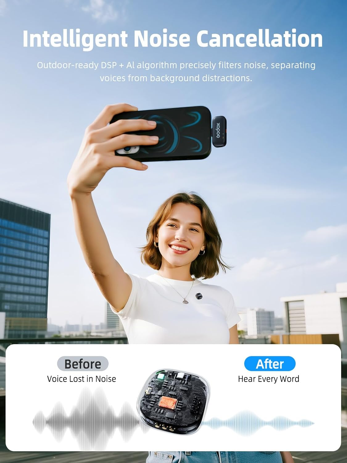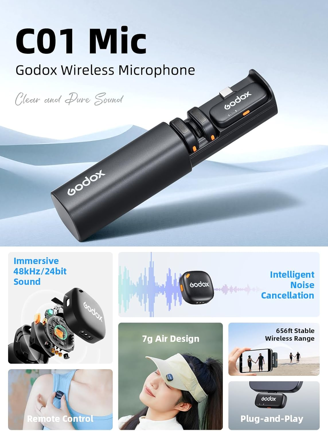 The Godox Kit2 C01 Wireless Microphone (Black, Type-C) is designed for content creators and mobile journalists who need professional audio on the go. Perfect for two-person shoots with a mobile device, this kit includes two transmitters with built-in microphones and a dual-channel USB-C plug-in receiver. With a 656′ transmission distance, DSP and AI noise-reduction algorithms, and automatic level control, your recordings stay crisp and clear. It also features remote shutter control, a 60W fast-charging pass-through, and a built-in 97mAh battery with charging case for extended usage. Includes 1-year warranty for peace of mind.