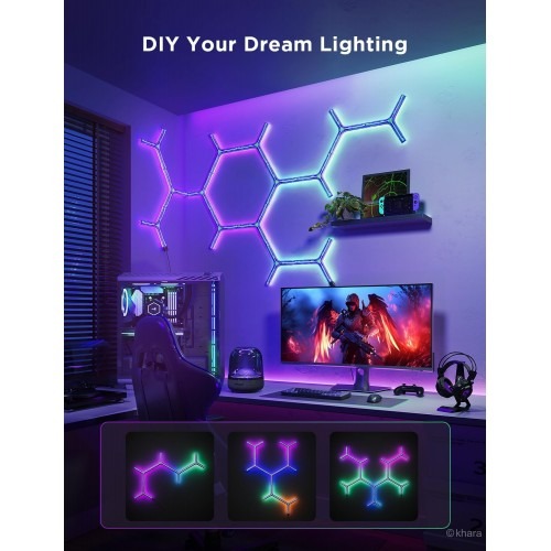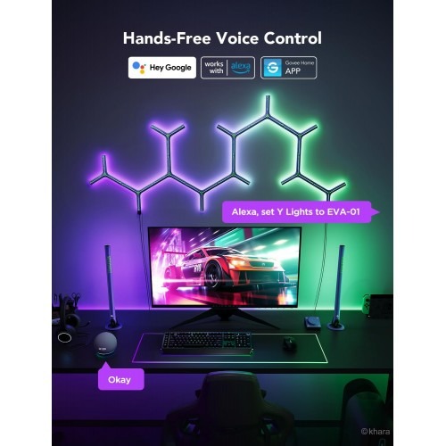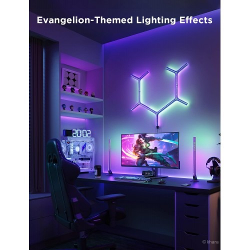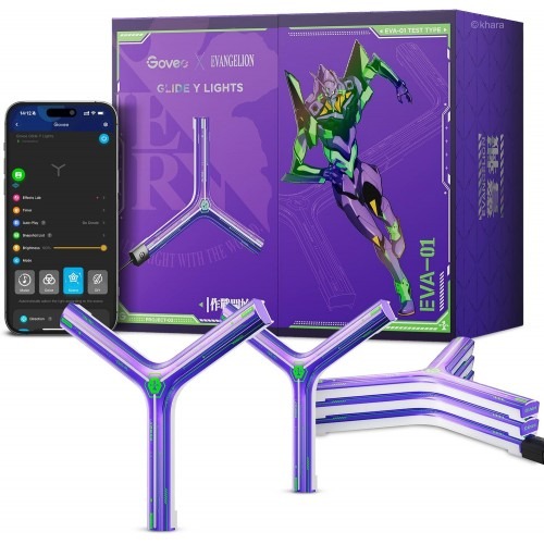 The Govee x Evangelion Gaming Wall Lights 6+2 (Model: H6063) is a smart ambient lighting solution designed to enhance your gaming or anime-themed space. This special edition set features six light sections and two connectors, allowing for customizable arrangements inspired by the iconic EVA-01 design. The modular design supports up to 12 light sections, enabling expansive configurations. The lights offer a dual-layered construction with a translucent faceplate and elevated diffusion strip, creating a three-dimensional lighting effect. With 16 million RGBIC color options and 61 scene modes, users can tailor the lighting to their preferences. The system is compatible with the Govee Home App, Alexa, Google Assistant, and Matter, providing versatile control options.
