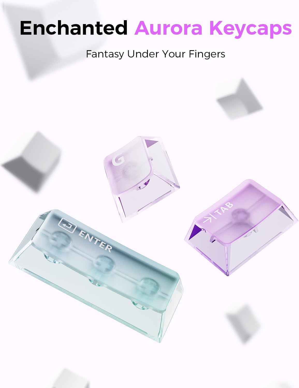 The GravaStar Mercury K1 Gaming Keyboard in Crystal Aurora blends elegant design with refined performance, transforming your desk into a glowing centerpiece. Featuring a sleek white base and sculpted hollow frame, this keyboard showcases gradient purple-green keycaps that refract RGB lighting like shimmering northern lights, delivering a clean, futuristic aesthetic that stands out in any setup.
