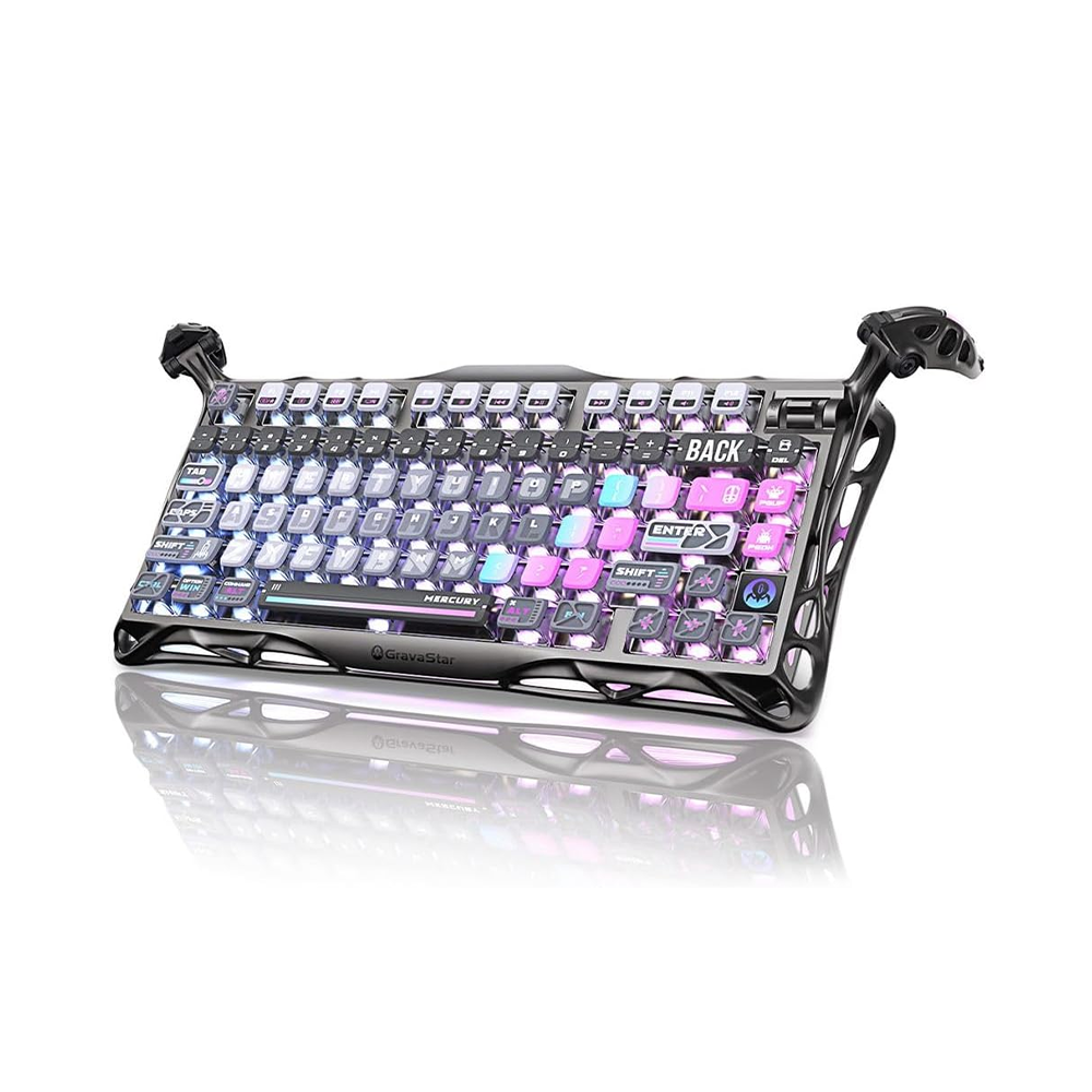 The GravaStar Mercury K1 Pro Wireless Mechanical Gaming Keyboard blends futuristic industrial design with premium mechanical performance. Built around a durable aluminum alloy skeletal frame, the K1 Pro delivers striking visual appeal while reinforcing stability across every keystroke. Its compact 75% layout maximizes desk space without sacrificing essential functionality, making it a powerful centerpiece for gaming, productivity, and creative workflows.
