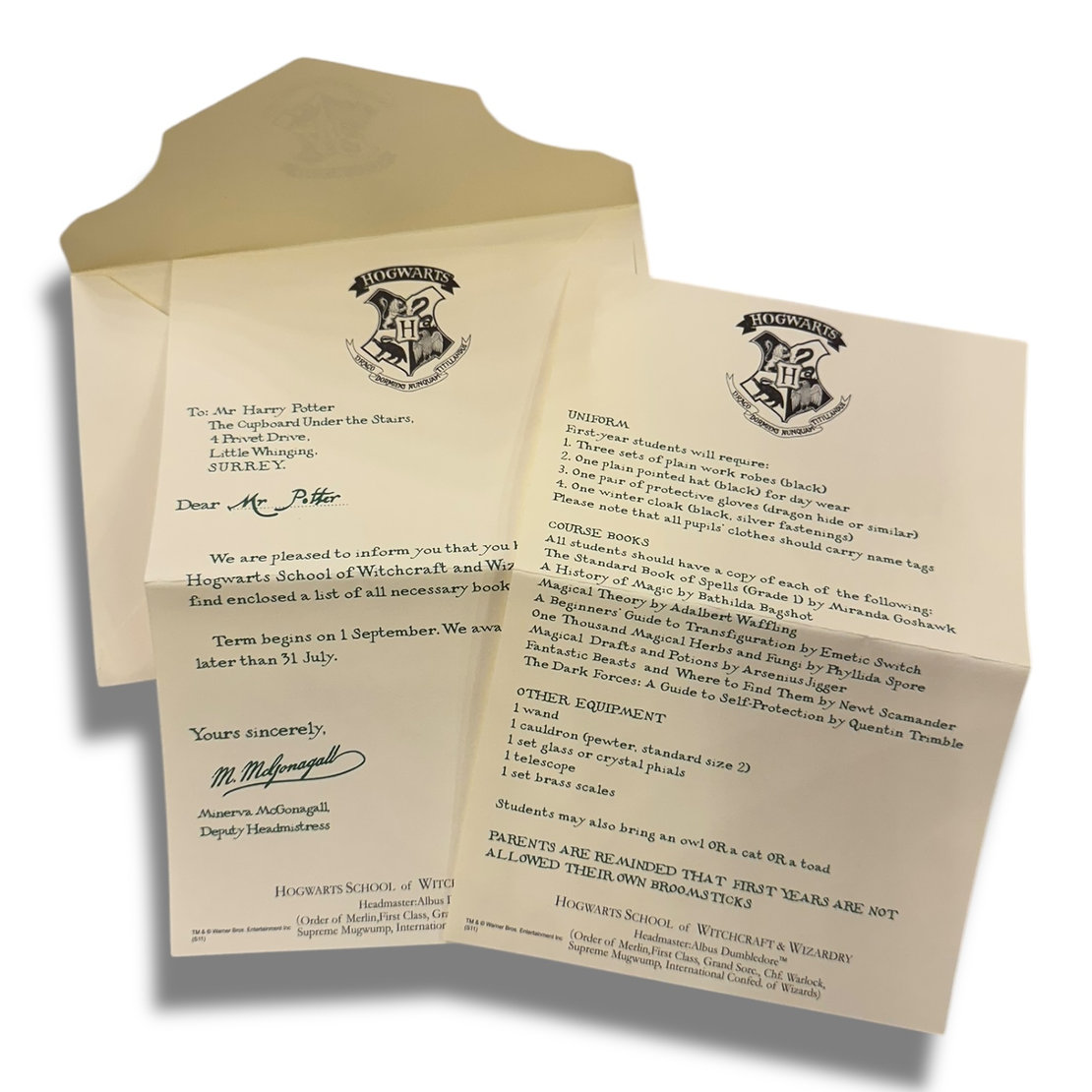 | Included Items | Hogwarts acceptance letter, school supply list, Hogwarts Express train ticket |
