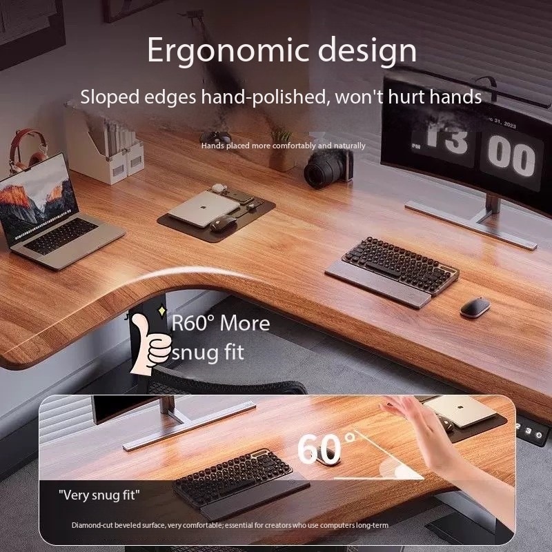 The curved desktop shape offers a comfortable, natural position for your arms, improving posture and reducing fatigue during long work sessions.