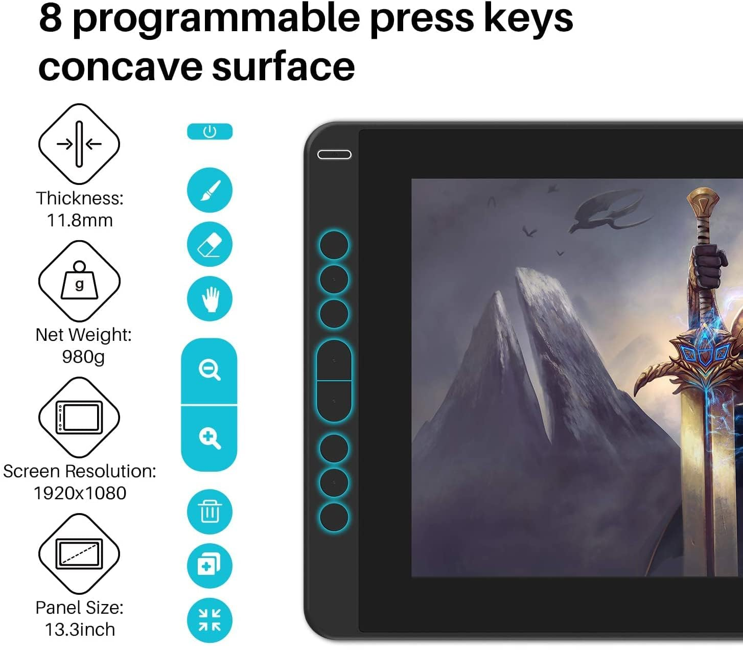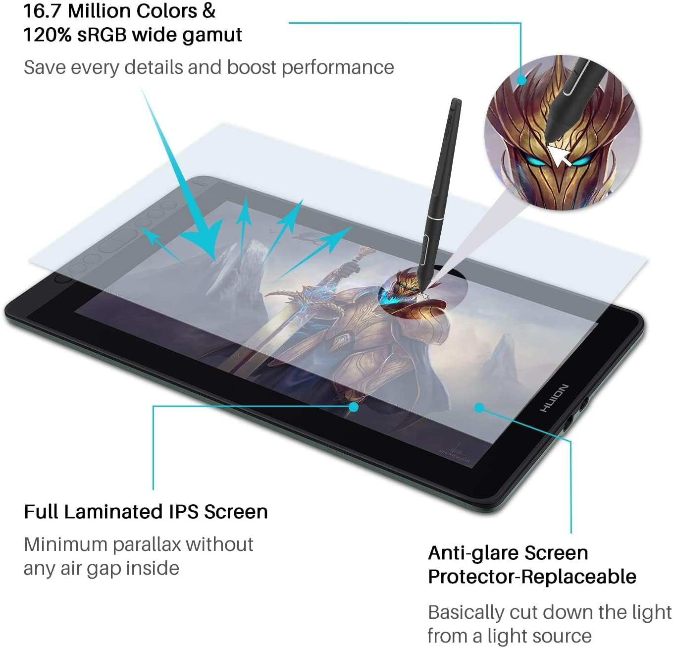 The HUION Kamvas 13 Graphic Tablet is a powerful and portable pen display designed for digital artists, designers, and content creators seeking precision and a natural drawing experience. Featuring a fully laminated 13.3-inch Full HD display, it significantly reduces parallax for accurate cursor positioning and smooth pen control. With a wide 120% sRGB color gamut, 16.7 million colors, and a 178° viewing angle, visuals appear vibrant and true to life. Powered directly via USB with no internal battery, the Kamvas 13 delivers true plug-and-play convenience across Windows, macOS, and supported Android devices—ideal for creative work at home or on the go.