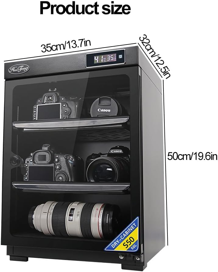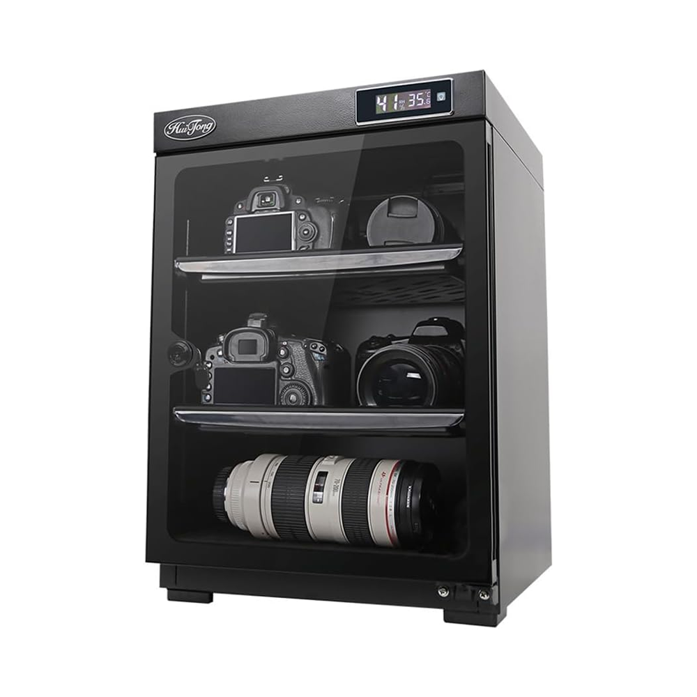 The HUITONG S-50D Digital Dry Cabinet is a reliable storage solution for cameras, lenses, memory cards, telescopes, and other sensitive electronic equipment. Designed to maintain optimal humidity levels, it helps prevent mold, corrosion, and damage caused by moisture. Its tempered glass door allows easy monitoring of contents, while a digital control system ensures precise humidity management. Compact yet spacious, the S-50D protects your valuable gear while keeping it easily accessible for photography or optical needs.