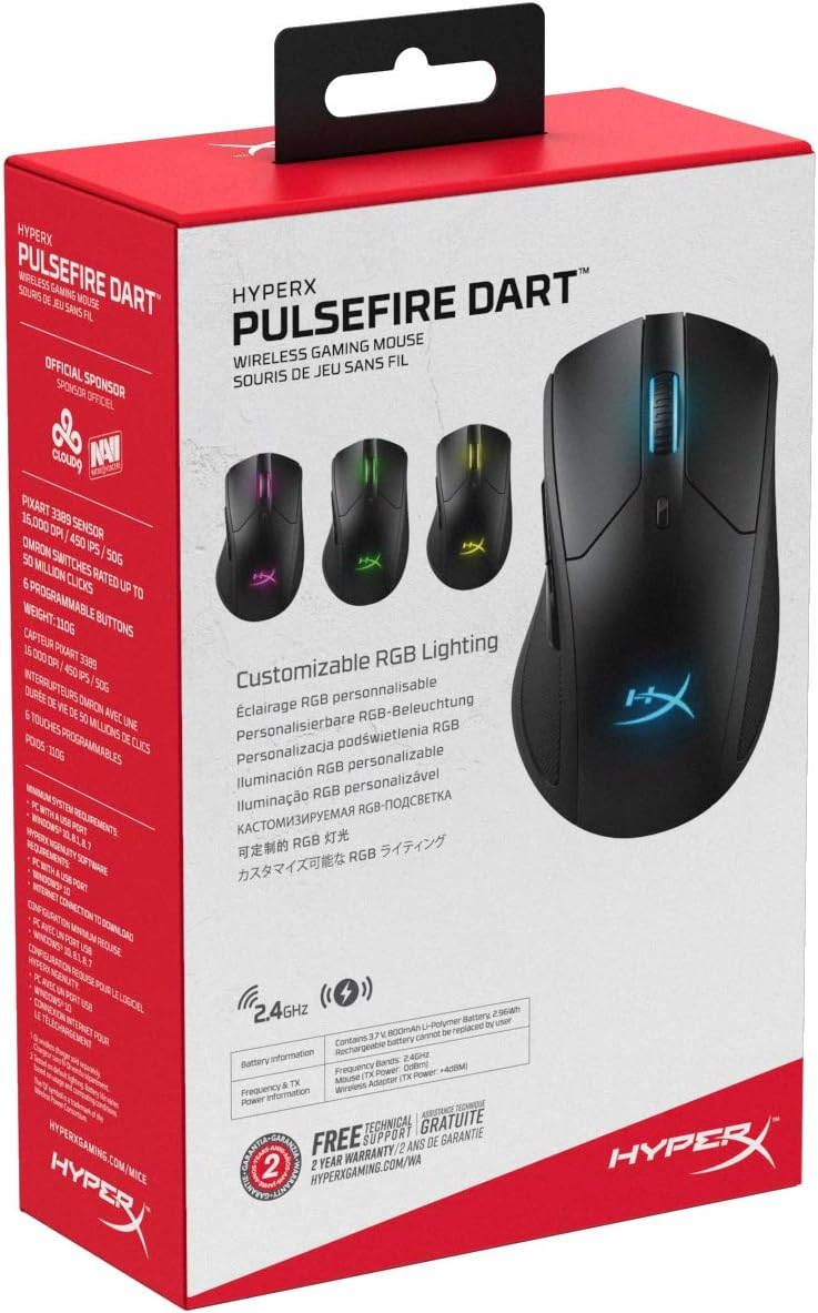 The HyperX HX-MC006B Pulsefire Dart – Wireless RGB Gaming Mouse delivers precision, comfort, and cutting-edge wireless technology for gamers. Equipped with the premium Pixart 3389 sensor, it provides accurate tracking and DPI control for every gaming scenario. Its ergonomic shape with padded leatherette grips ensures extended comfort during long sessions, while the vibrant RGB lighting adds a stylish, personalized touch to your setup. Compatible with wireless Qi charging, the Pulsefire Dart keeps you powered up and ready for action without the hassle of cables.