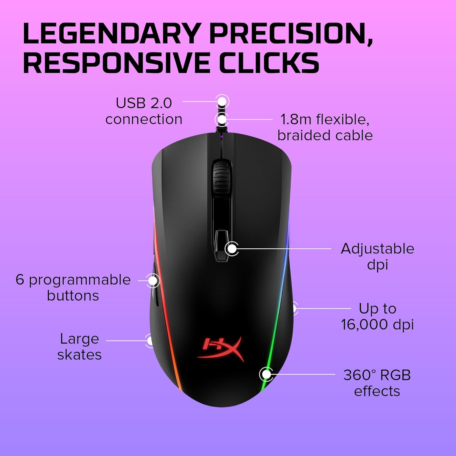 The HyperX Pulsefire Surge RGB Wired Optical USB Gaming Mouse is designed for gamers who demand precision, performance, and eye-catching aesthetics. Equipped with the Pixart 3389 sensor, it supports native DPI up to 16,000 for ultra-precise tracking in every game. The mouse features six programmable buttons and reliable Omron switches rated for 50 million clicks, ensuring durability and responsive control during intense gaming sessions.