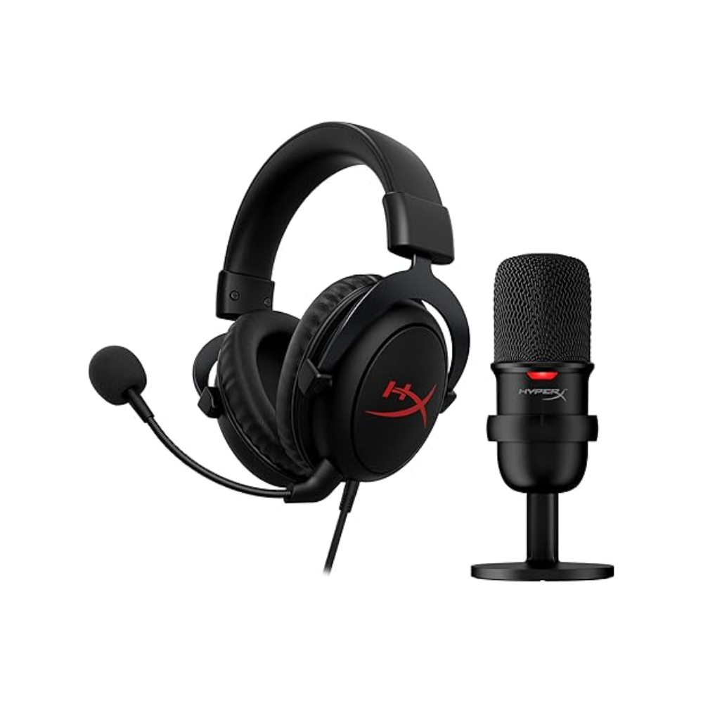 The HyperX Streamer Kit is an all-in-one audio solution designed for gamers, streamers, and content creators seeking high-quality sound and crystal-clear voice capture. It includes the HyperX Cloud Core Gaming Headset and the HyperX SoloCast USB Microphone, providing both immersive gaming audio and professional-level microphone performance in one convenient package. The Cloud Core headset features 53mm drivers, memory foam cushions, and a durable aluminum frame for comfort during long sessions. The SoloCast microphone offers a cardioid condenser capsule with tap-to-mute functionality and plug-and-play USB connectivity, ensuring your voice is captured clearly without background noise. Ideal for beginners and pros alike, this kit is compatible with PC, Mac, and major consoles, making it perfect for streaming, gaming, and online communication.