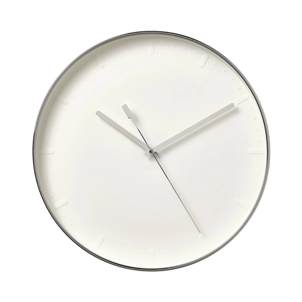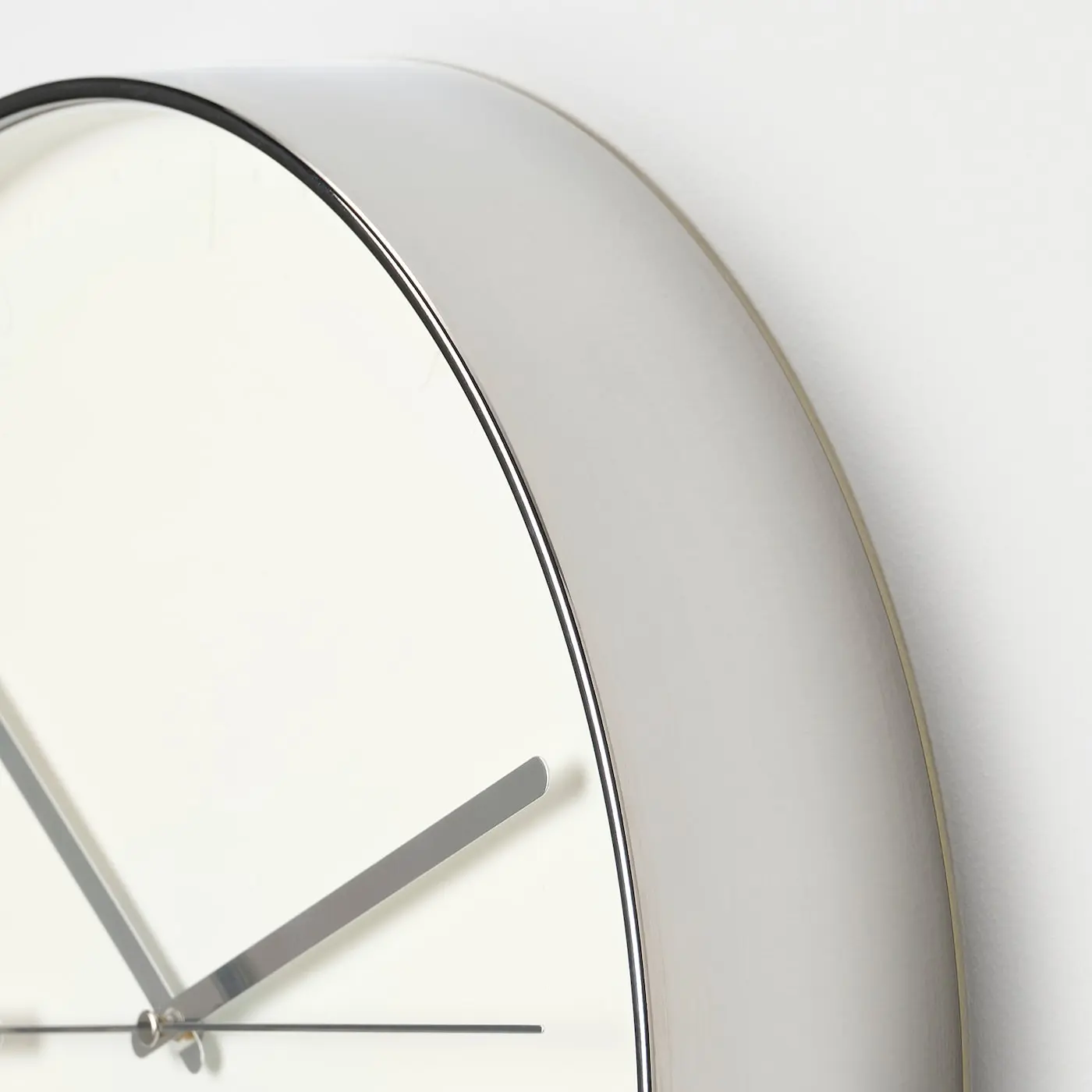 The IKEA MALLHOPPA Wall Clock in silver is a minimalist and elegant timepiece designed for any room. Its silent quartz movement ensures no ticking noise, while the chrome-plated steel frame and simple white dial add a subtle decorative touch.