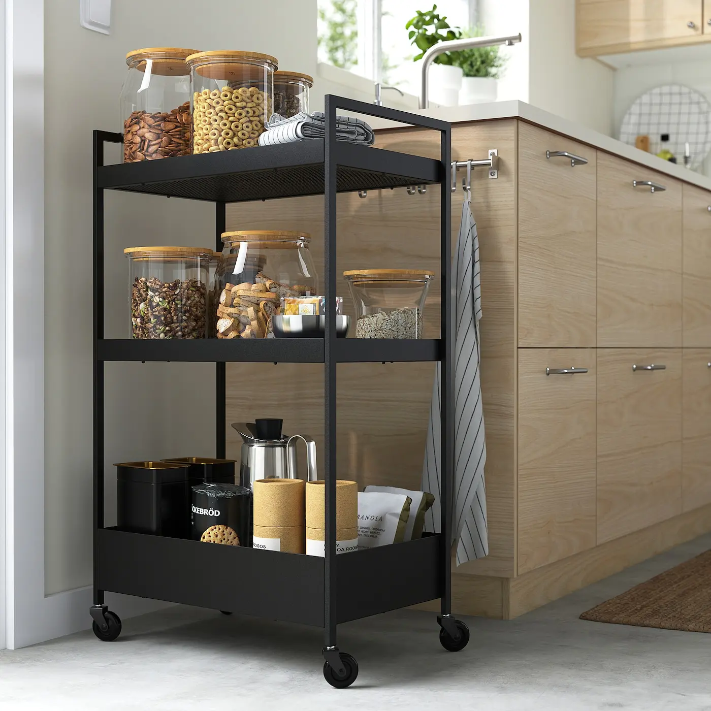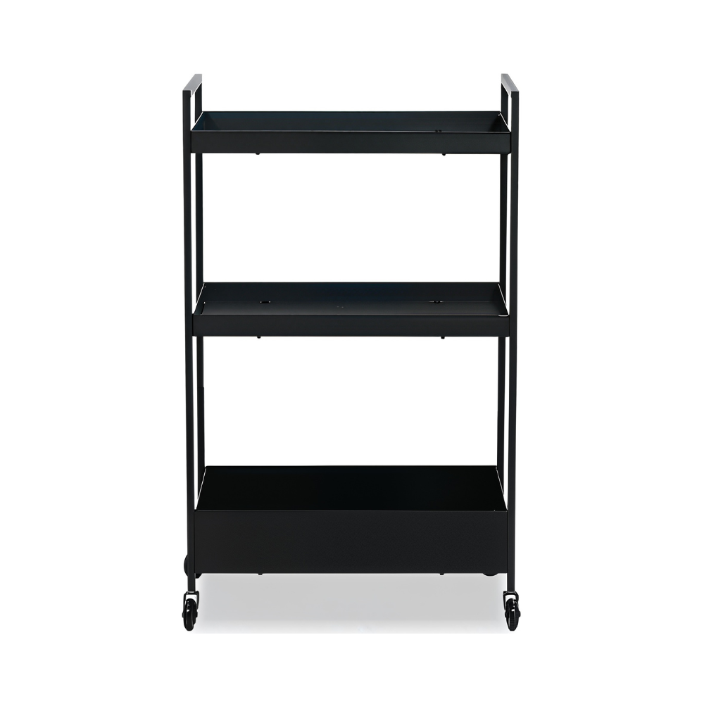 The IKEA NISSAFORS Trolley, Black is a versatile and compact utility cart designed to provide additional storage in kitchens, bathrooms, bedrooms, hallways, or offices. Featuring three open shelves and a lower tray, it allows easy organization of utensils, toiletries, towels, desk accessories, or personal items. The trolley is equipped with four castors for smooth mobility and fits neatly into tight spaces for efficient storage. Its sleek matte black steel finish ensures durability while complementing any interior style.