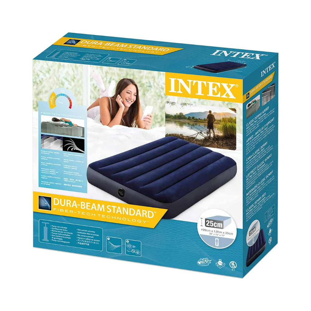 The Intex Dura-Beam Standard Classic Downy Inflatable Mattress delivers a comfortable and supportive sleep experience with its 25 cm height and advanced Fibre-Tech construction. Designed for both indoor and outdoor use, this mattress features a soft, waterproof flocked top and a built-in 2-in-1 valve for fast inflation and deflation. Lightweight and foldable, it’s easy to store and transport, making it perfect for home, camping, or travel use.