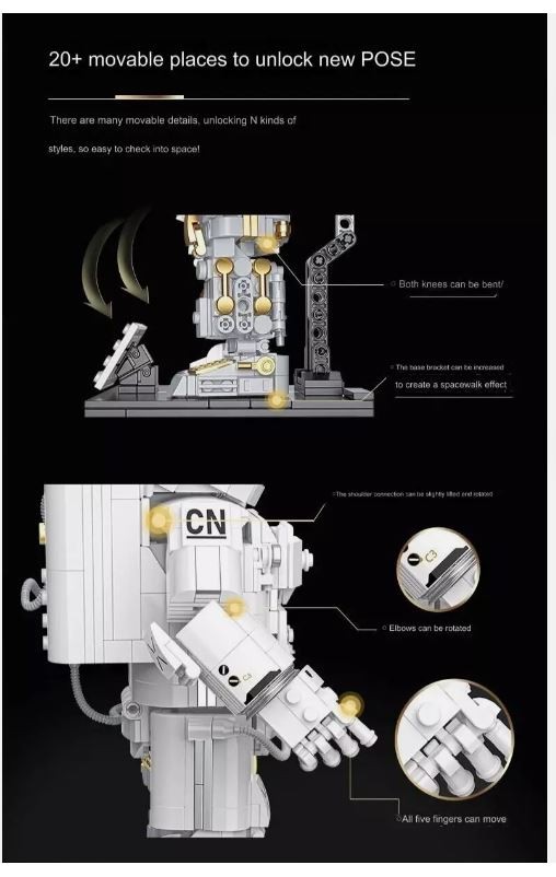 | Functions | Display model, collectible astronaut build, poseable elements depending on design |