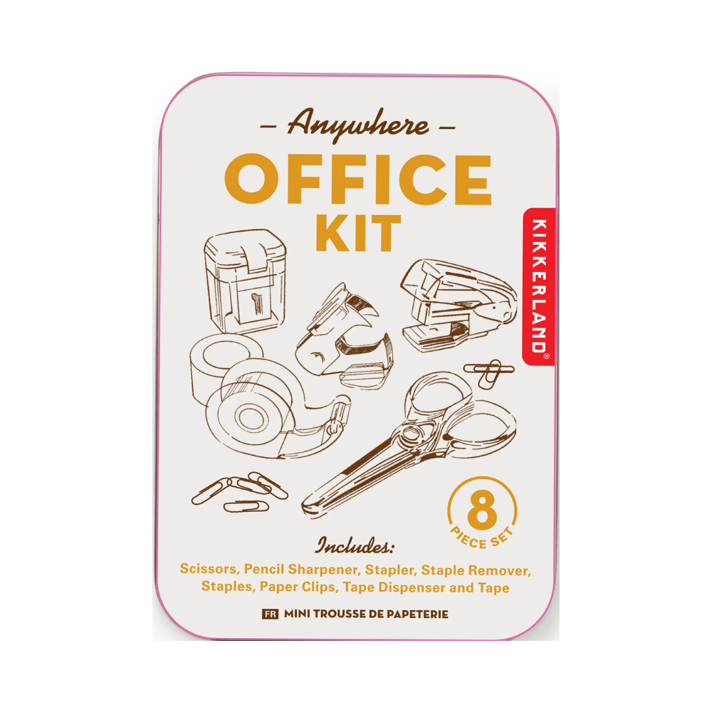 The Kikkerland Anywhere Office Kit is a compact 8-piece mini stationery set packaged in a reusable tin. Perfect for on-the-go fixes or a small desktop drawer, it includes a mini stapler (with extra staples), tape dispenser (with extra tape), staple remover, pencil sharpener, scissors, and 20 paper clips. Durable plastic and metal components make it a handy little kit for students, travellers, and remote workers.